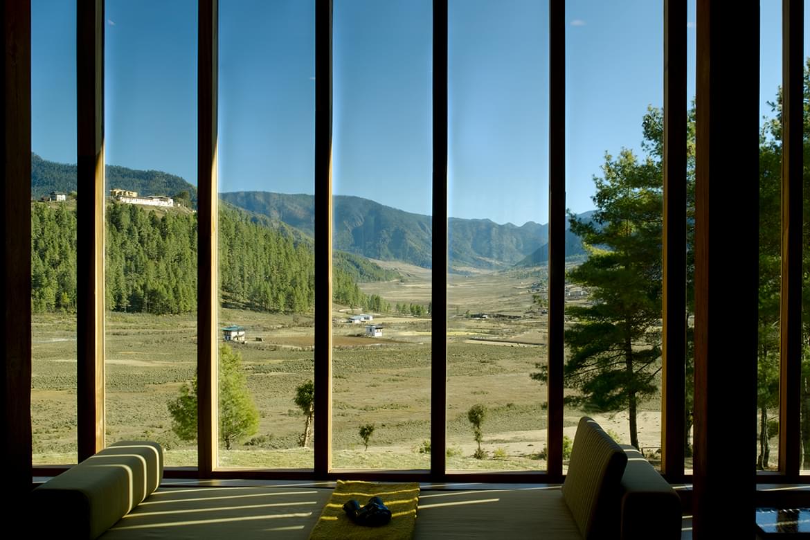 Open-plan bedroom and living area with serene valley views. In the little-visited Phobjikha Valley near the village of Gangtey, the eight-Suite Amankora Gangtey is set on a forested knoll with scenic views of the valley floor and the 16th-century Gangtey Goemba monastery. Part of an important wildlife reserve, the valley is home each winter to a flock of 300 endangered black-neck cranes. Suite view overlooking across the valley.