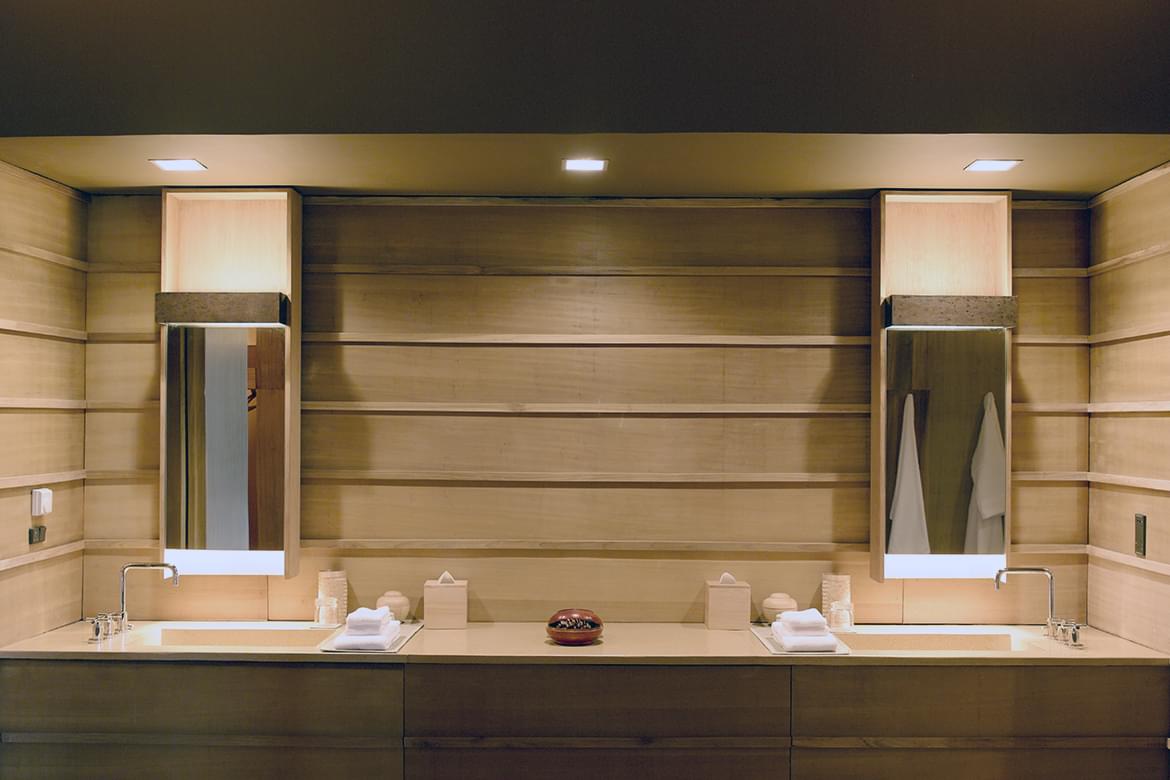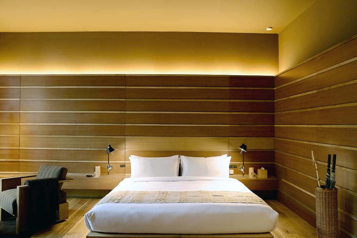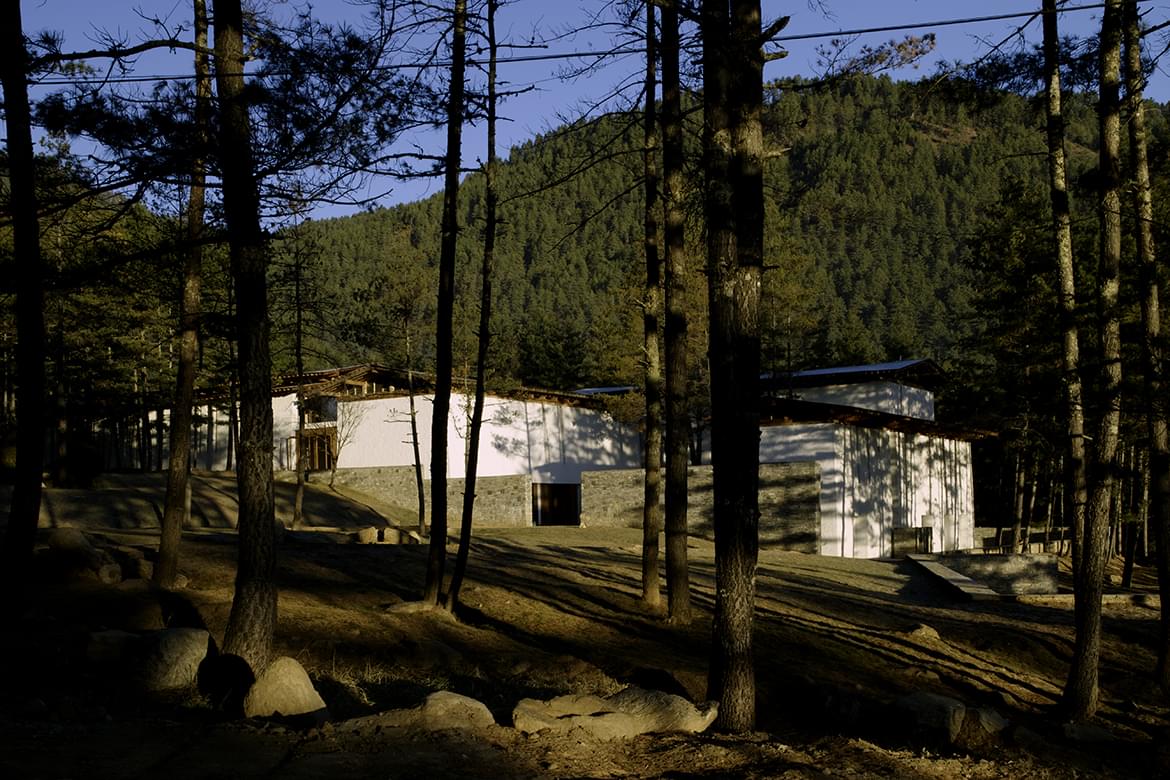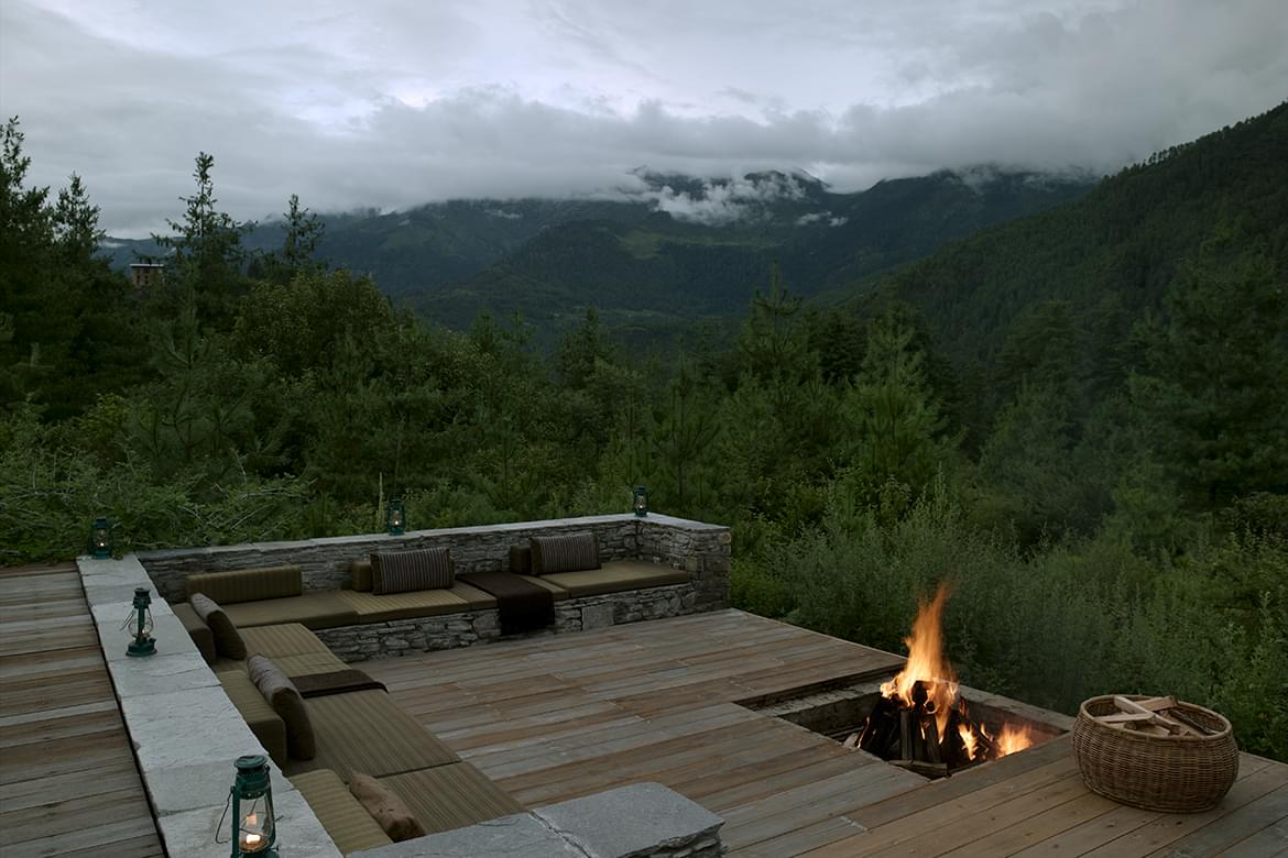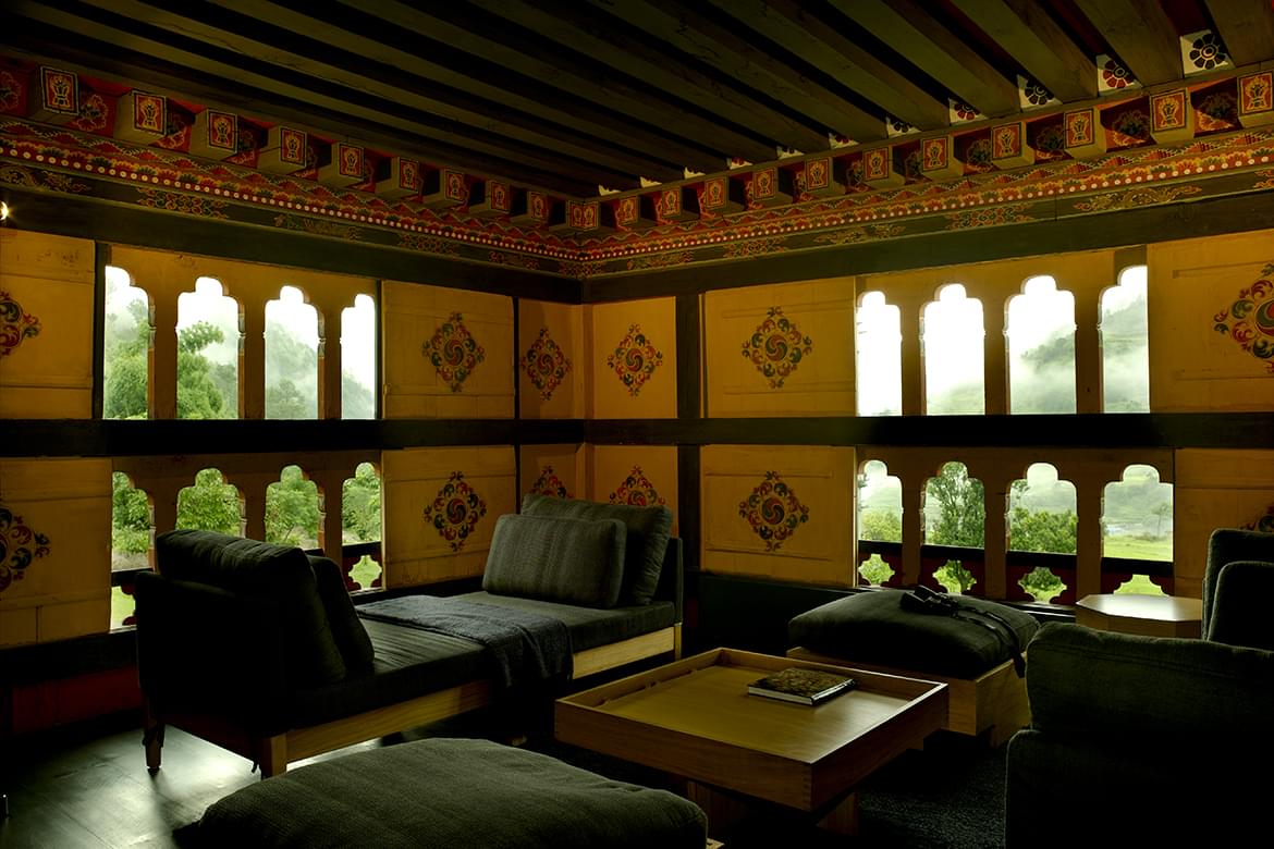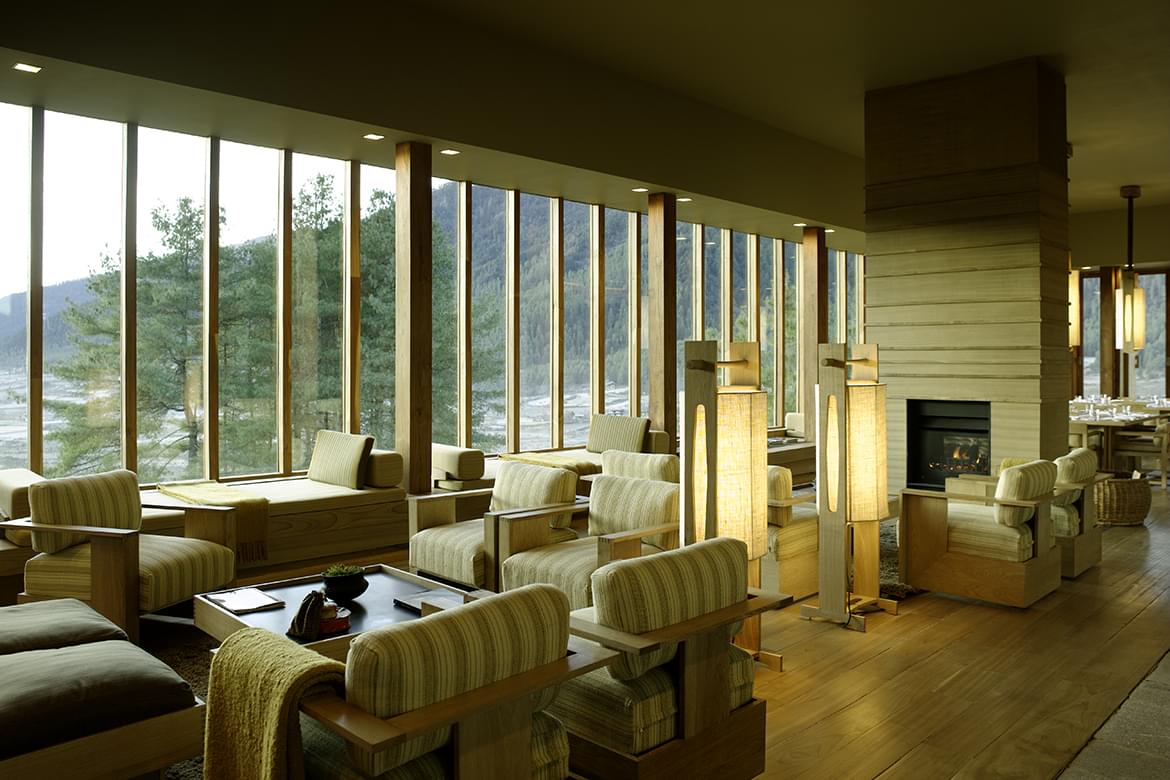 Combined bedroom and living area with terrazzo-clad bath and forest views. At an elevation of 2,250 metres, Paro Valley is the entry point for most journeys through the Kingdom. Surrounded by pine forests, the 24-Suite retreat contrasts rustic elements with contemporary design.