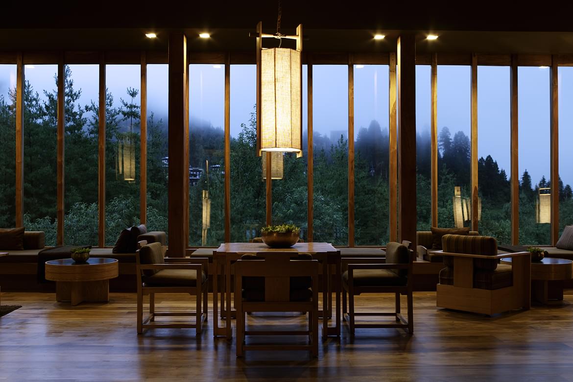 Wood-panelled interior, with a landscaped courtyard and pine forest views. Set in the upper reaches of the Motithang area, the 16-Suite Lodge of Amankora Thimphu is close to the capital’s sights and shopping yet remains a secluded retreat.