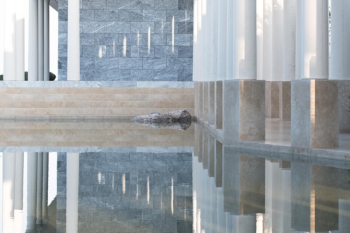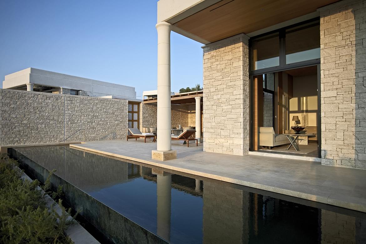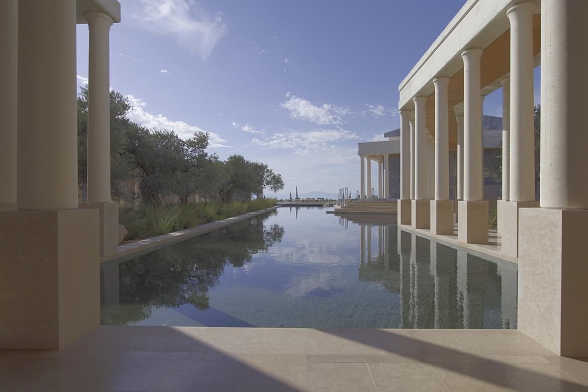 Surrounded by undulating olive groves and overlooking the turquoise waters of the Aegean sea, Amanzoe is just a 10 minute drive from the tavernas and bustle of Porto Heli. From here a short boat ride takes one to the vibrant and historic island of Spetses. The road approaching Amanzoe winds uphill through olive groves, offering beautiful views of the sea before reaching the arrival pavilion.