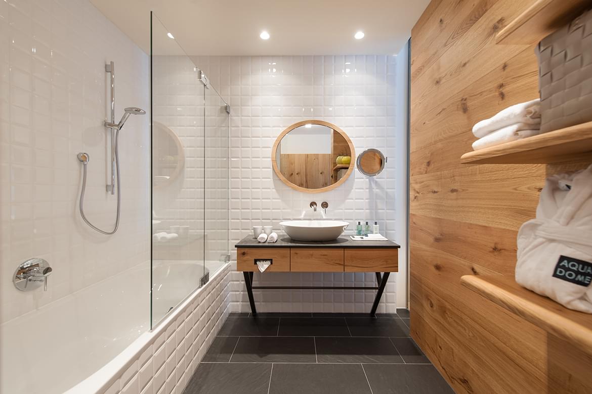 A heated walkway connects the hotel to the main spa and sauna area. Each room is decorated using warm colours and wood from the local region. The contrast of cultures continues in the hotel restaurant, where traditional alpine decor and a new south-facing pergola provide the perfect backdrop for a sumptuous breakfast buffet including hot and cold dishes, freshly baked bread and homemade jams and marmalades. In the evening diners can choose from a selection of dishes and themed buffets, before retiring to the lobby bar for a relaxing drink. For business travellers and companies, the AQUA DOME also offers a 900m² meeting area capable of hosting events for up to 800 guests and even spacious enough for car presentations.