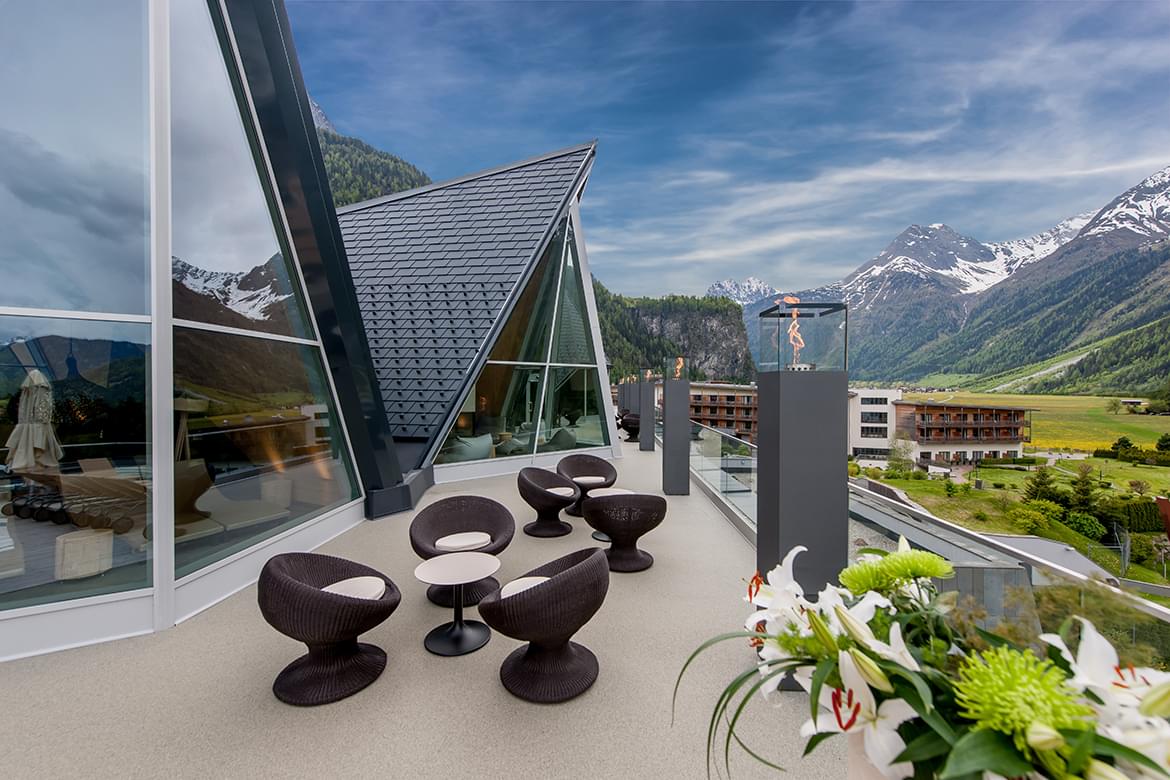 Reserved exclusively for guests staying at the AQUA DOME Hotel, the recently opened 2000m² premium spa is spread across two floors and offers magnificent views of the surrounding mountains. Its modern design combining pinewood, granite and large glass facades with panoramic views brings the raw beauty of the Ötztal Valley into the AQUA DOME. This focus on nature is also to be found in the spa and sauna area, with its use of local mountain herbs, woods and minerals, while a spectacular combination of fire and water complete the modern yet traditional alpine atmosphere.