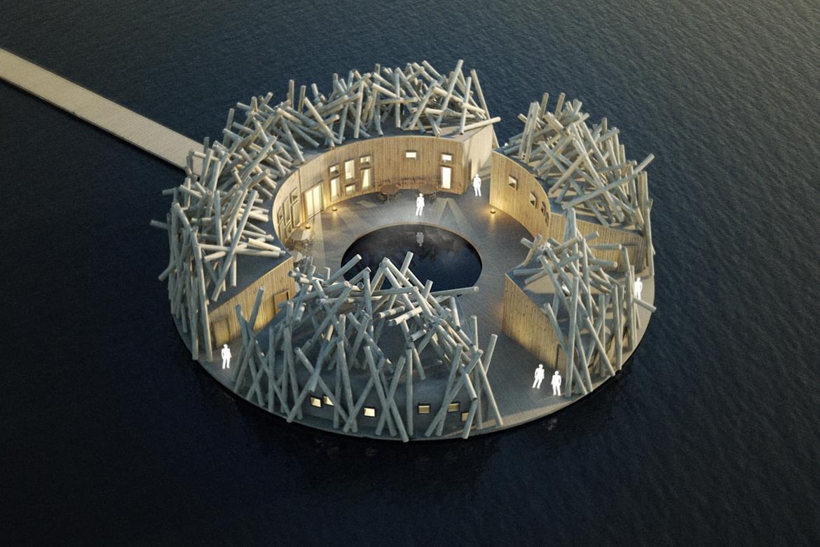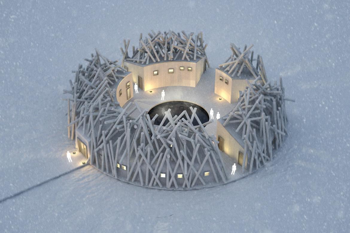 Arctic Bath will be a new international floating hotel and cold bath in Harads, Swedish Lapland. Close to nature, the building is inspired by the timber floating era when the river was used for transporting timber. Sometimes the logs got jammed in the rapids and caused problems. Such logjam is the inspiration for Arctic Bath buildings. The building becomes a monument, a reminder about the importance of forests for the entire country’s development. The main building is inspired by a jam of floating timber in the river. In the old days, the tradition was to transport the timber logs on the river.