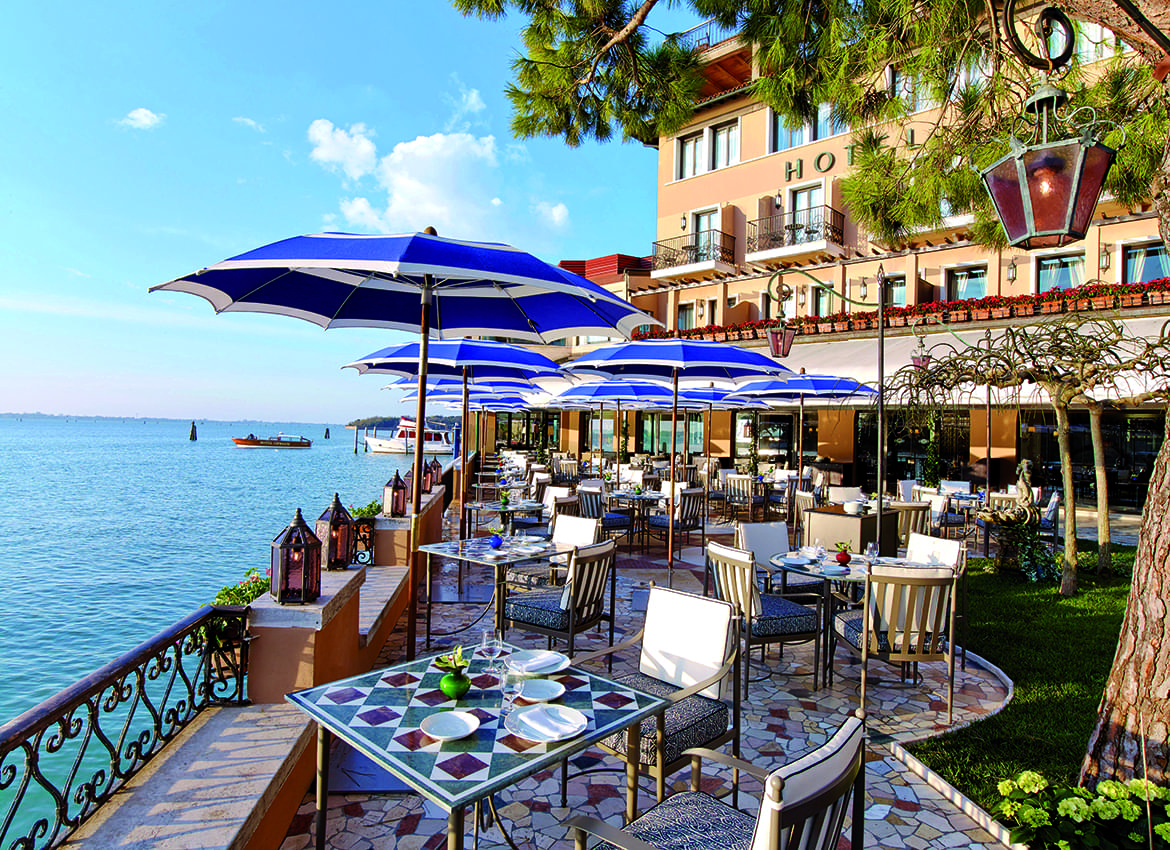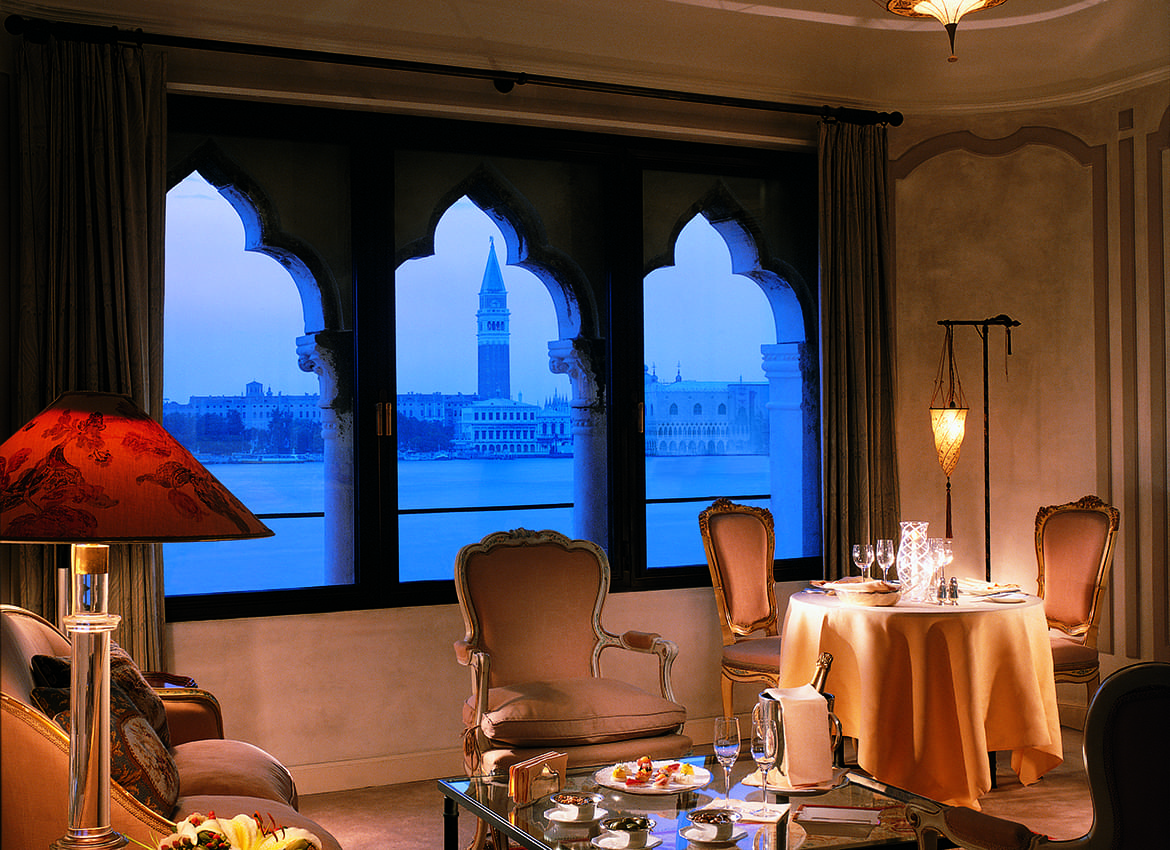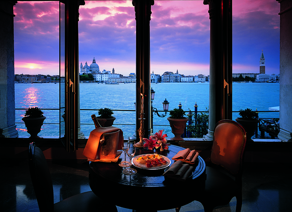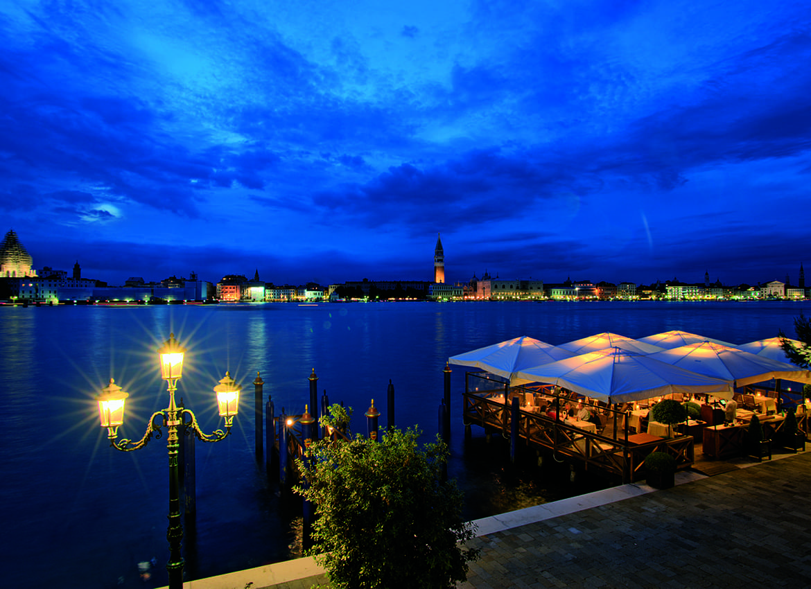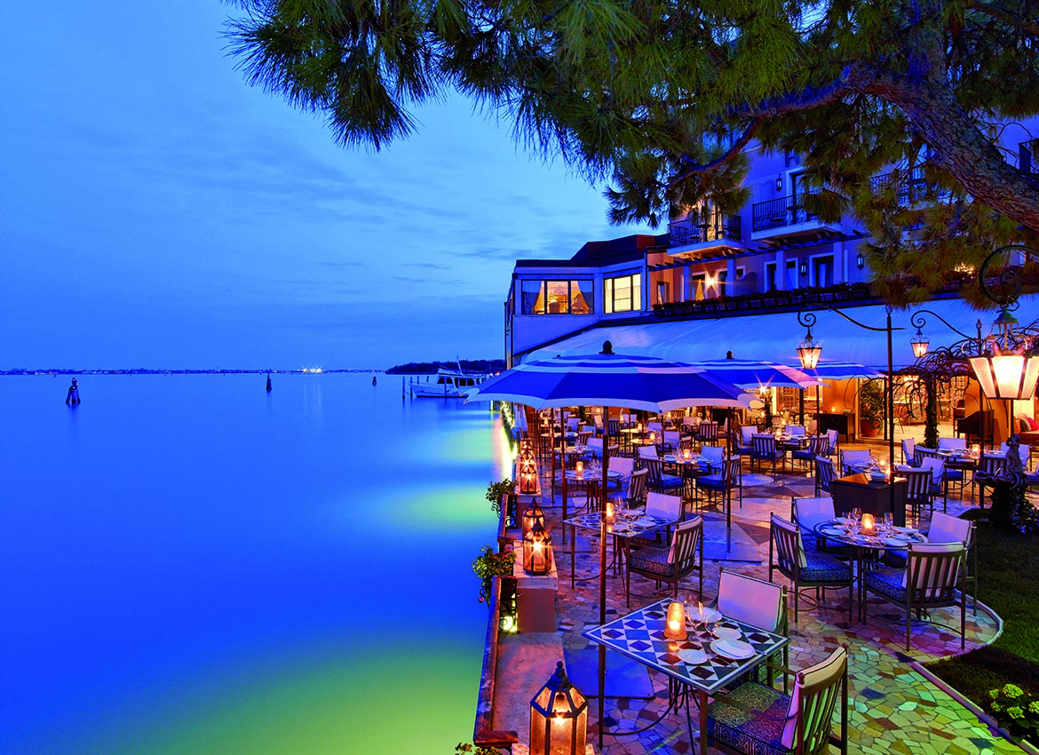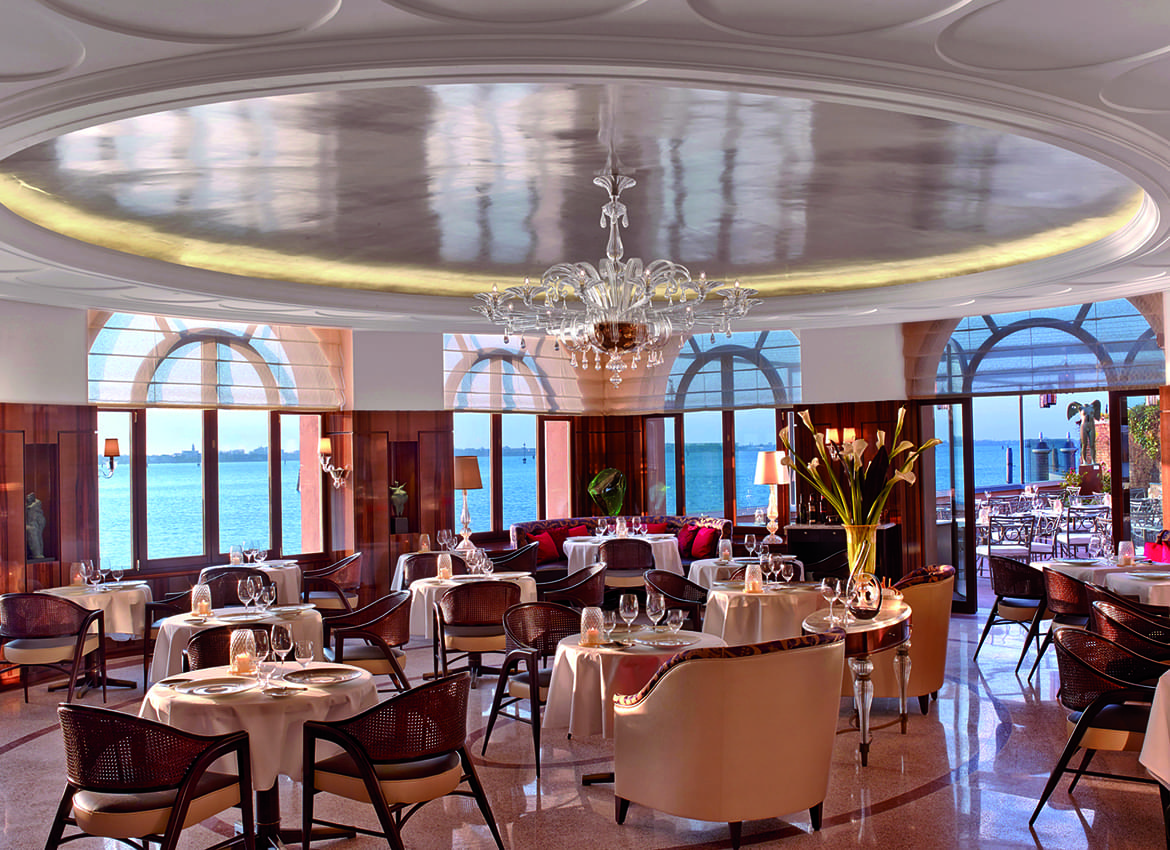 Take your seat beneath handmade Murano glass chandeliers and a decadent golden ceiling. Admire stunning lagoon views from the terrace.
