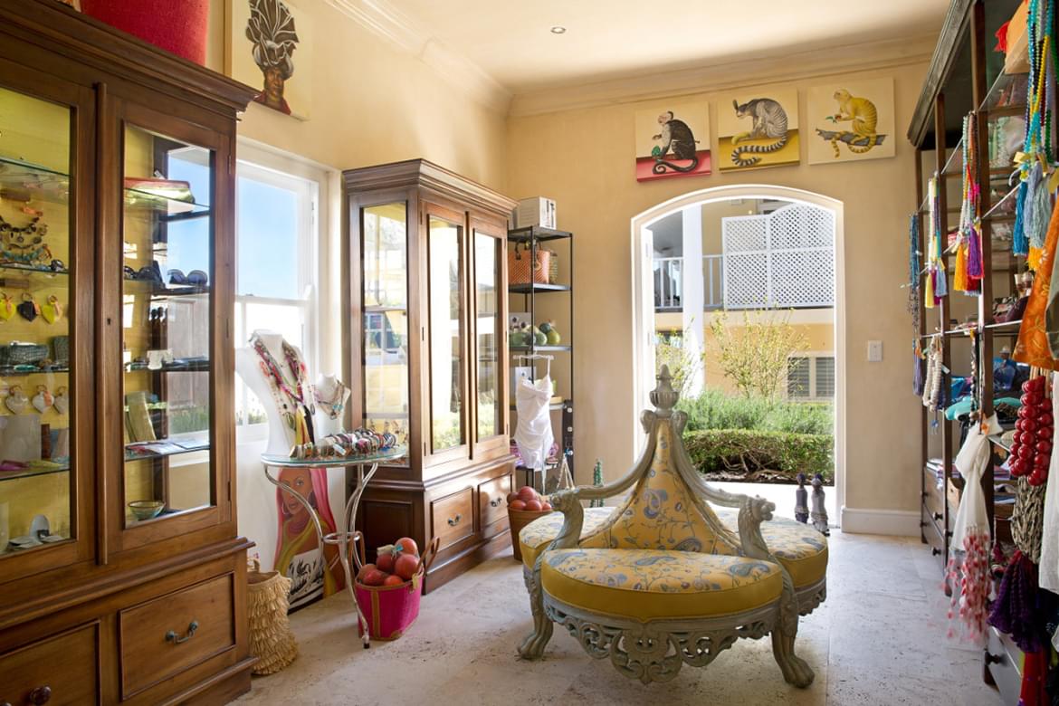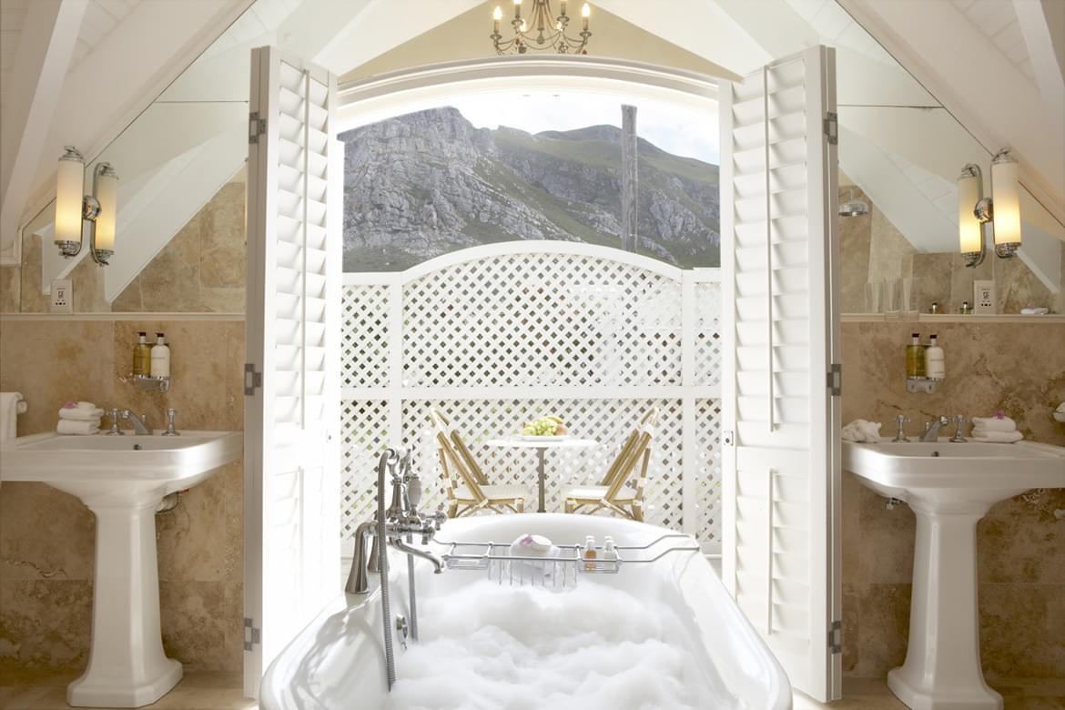 One of the luxury rooms, situated in the middle of the House. The suite opens onto a patio and pool area, furnished with a daybed and table and chairs. Opulent furnishings include an extravagant king-size four-poster bed with hand-carved antique Indian buttresses. The other Luxury Room offers wonderful sea views from its balcony, which is furnished with cane tables and chairs. Inside guests find magnificent décor, including a French gold antique chair and shagreen desk. The bathroom opens onto a mountain-facing balcony and is fitted with two shell mirrors, double marble-topped vanities and a marvellous freestanding Victorian bath.