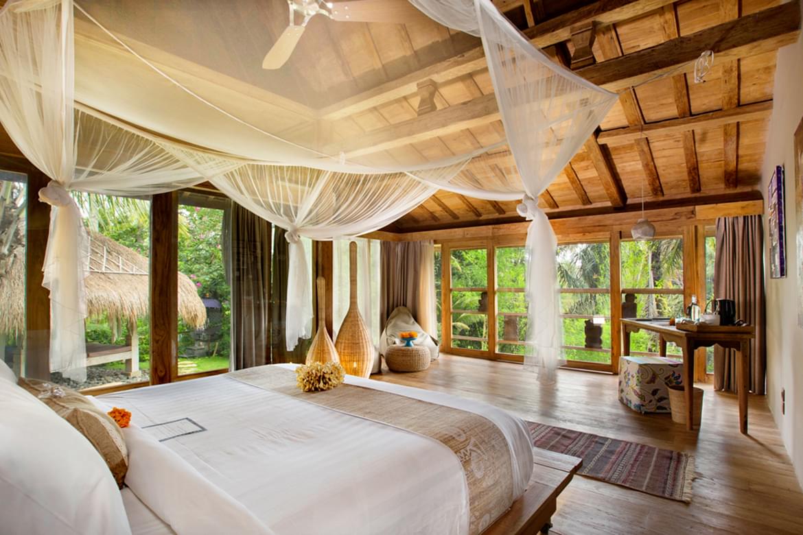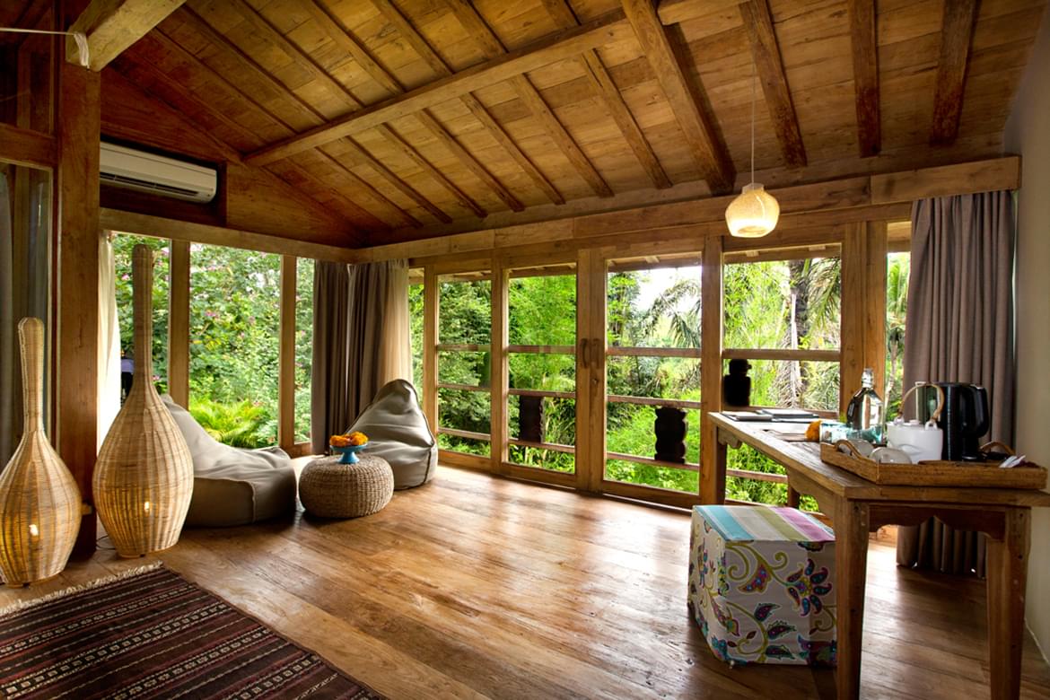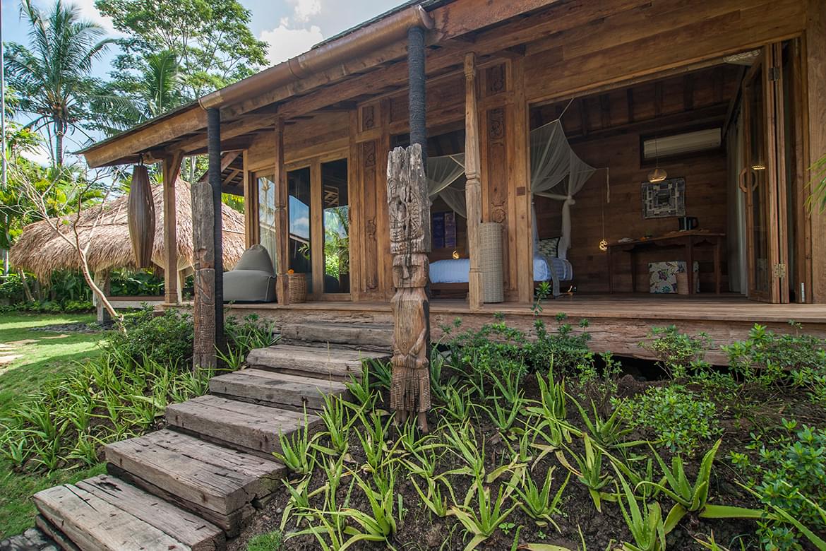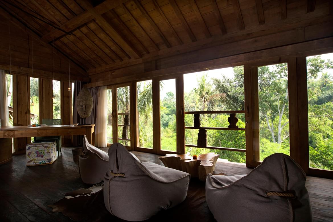 The site is mould by Alexa Aguila Genoyer’s artistic touch which you’ll discover right from the lobby through her colourful paintings in contrast with the sobriety of the chosen materials such as teak, lava stone. She has succeeded in creating a very special ambiance that makes modernity serve tradition, nestled into the abundant greenery. Sobriety and the refinement of the decoration lend to the site that special soothing touch, an invitation to relax body and soul in the spiritual heart of Bali. Weathered recycled timber, antiques from Sumba and other island of Indonesia were used create unique interiors rich in character.