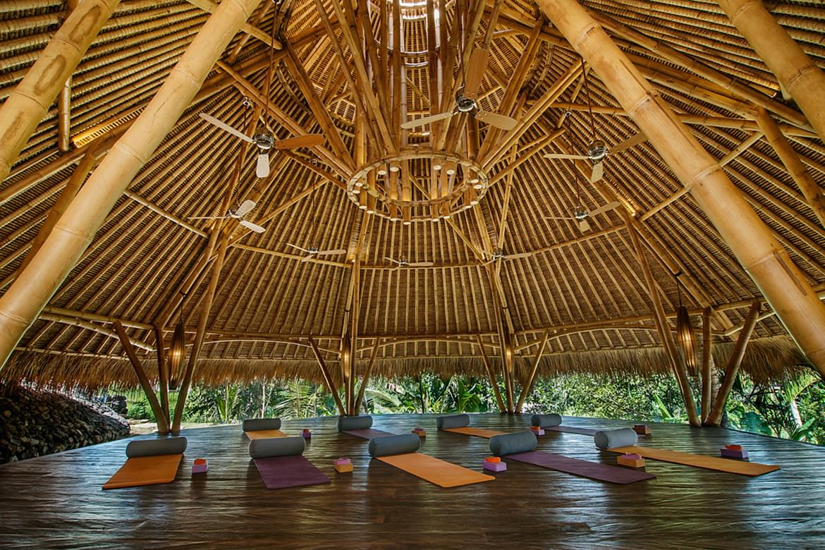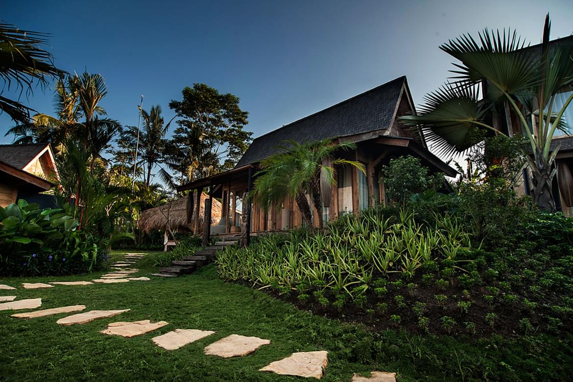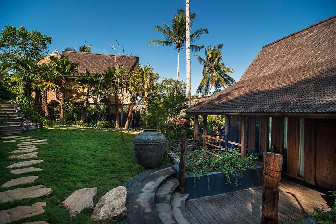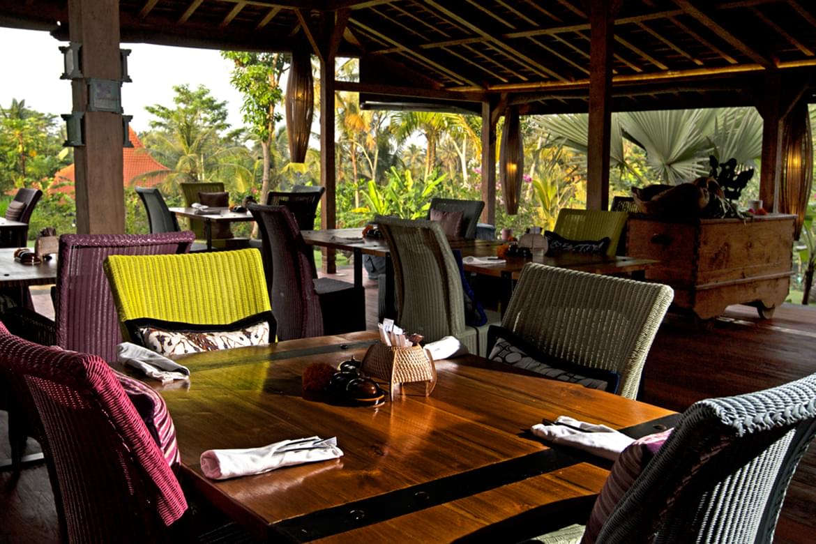 The site is mould by Alexa Aguila Genoyer’s artistic touch which you’ll discover right from the lobby through her colourful paintings in contrast with the sobriety of the chosen materials such as teak, lava stone. She has succeeded in creating a very special ambiance that makes modernity serve tradition, nestled into the abundant greenery. Sobriety and the refinement of the decoration lend to the site that special soothing touch, an invitation to relax body and soul in the spiritual heart of Bali. Weathered recycled timber, antiques from Sumba and other island of Indonesia were used create unique interiors rich in character.
