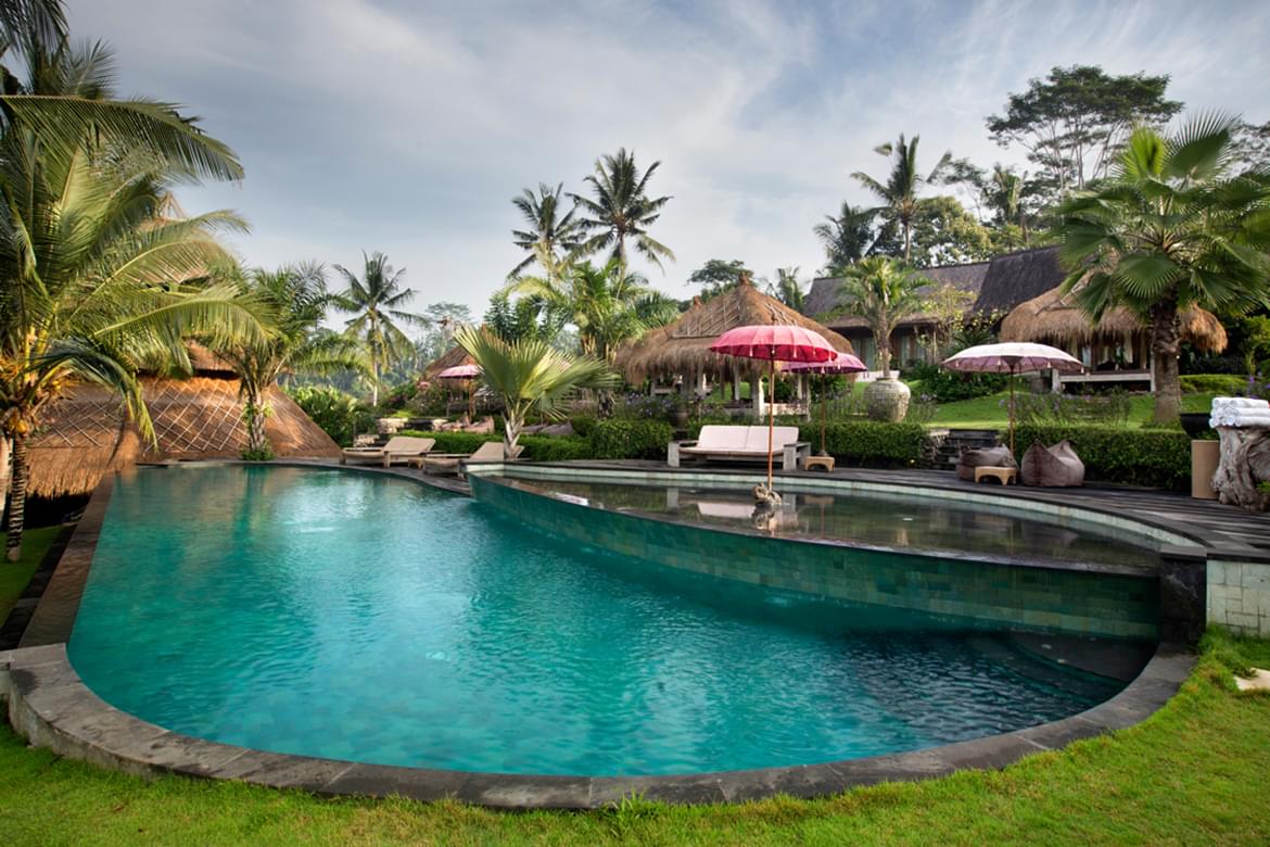 Between heaven and earth, 3.5 km from the centre, in the middle of rice paddies, you’ll discover “Blue Karma Ubud”. In the middle of this verdant haven of peace, built with respect of the environment, surrounded by fruit trees and deliciously perfumed plants, nestle a 25m pool of supple shape, resort’s pagoda “Karma Yoga”, gazebos with their thatched roofs as well as many other resting areas.