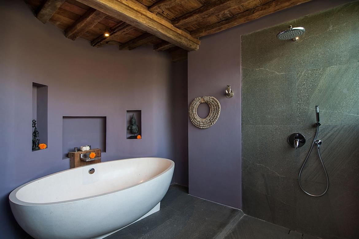 The charming and romantic atmosphere of the Superior and Deluxe Suite Room of 59 to 70 m2, with their airy mosquito nets and the coloured paintings on the walls are an invitation to cocooning. The originality of the interior bathrooms consists in the sophisticated mixture of traditional materials, such as the stone basins, with the modern comfort of LED lighting on the mirrors.
