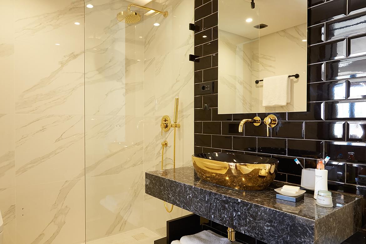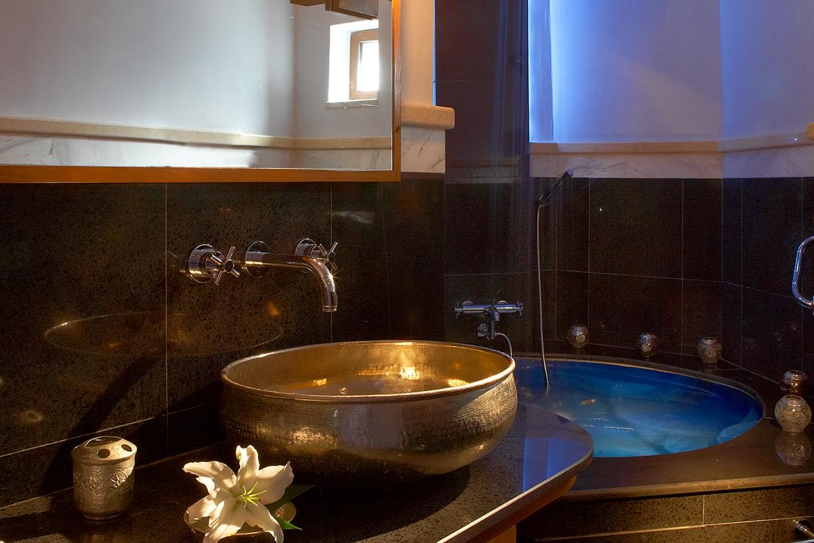 All suites offer a sea view or garden view, private swimming pool or Jacuzzi on the balcony. Uniquely designed marble or granite bathroom features Jacuzzi for two persons with rain shower.
