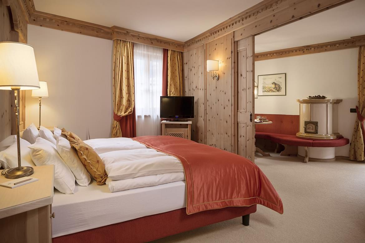There are three suite located on the first, second and third floors. They are King Suites with an area of 48 mt², equipped with a sleeping area with a four-poster bed and a living room with the possibility of adding two supplementary beds. The floor has a combination of larch wood and wool carpet, and the boiseries are made of natural Swiss Pine that gives the particular scent of resin and wood. A special touch of warmth and comfort is given by the precious majolica stove painted in green and cream, hand-decorated with the symbols of the rooms.