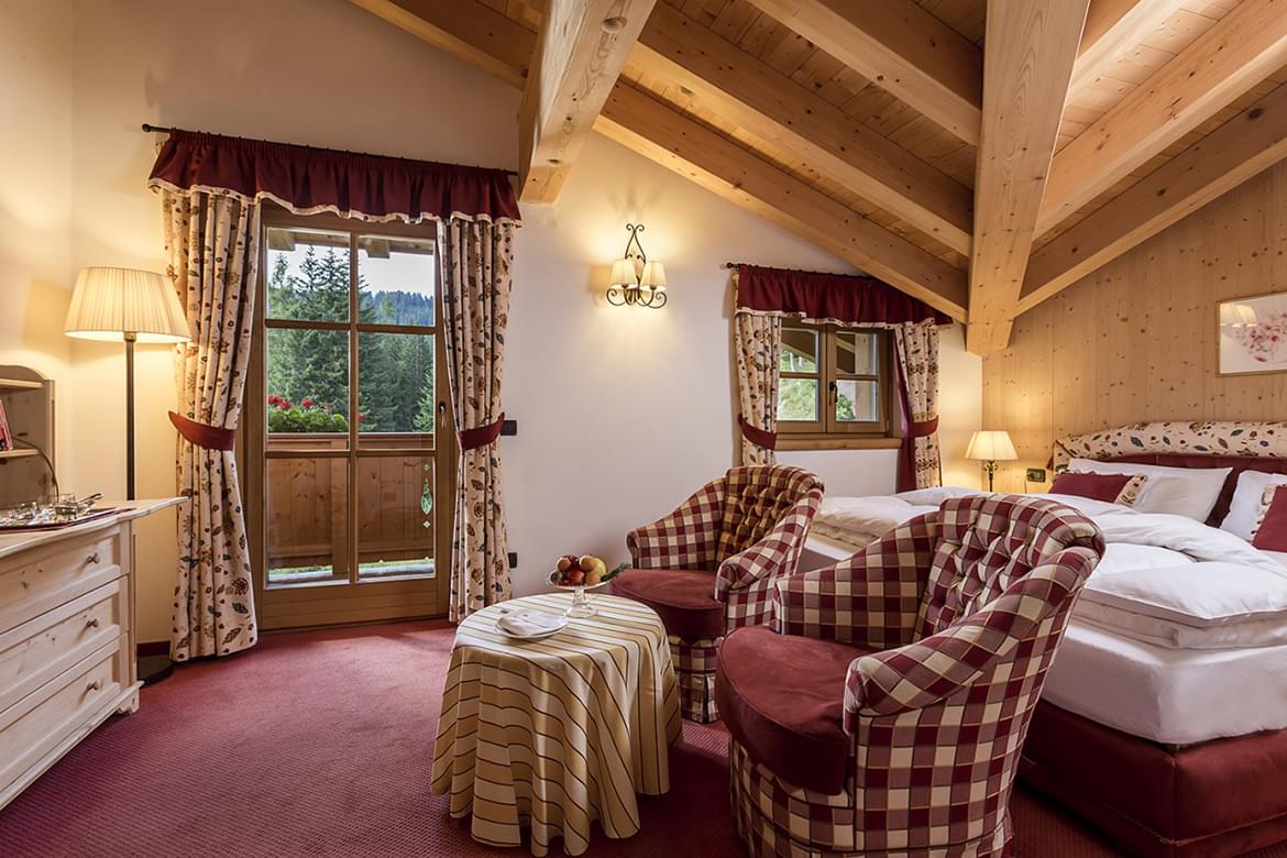 Junior Suites with an area of 32 mt², equipped with 2 beds and a comfortable sofa bed. All three suites face the Spinale cable car and enjoy the view of the forest, the ski slope arrival and, in the distance, the Pradalago mountain. Ones suite located on the first floor and differs from the other thanks to a small lawn and a private bathroom with a Teuco hydro-shower, other two suites located respectively on the 2nd and 3rd floor, have a large balcony facing north and a bathroom with a Teuco hydro-bathtub and a walk-in closet.