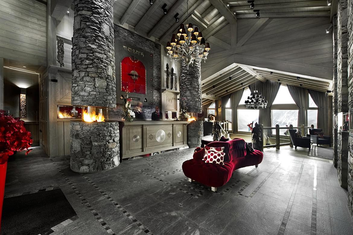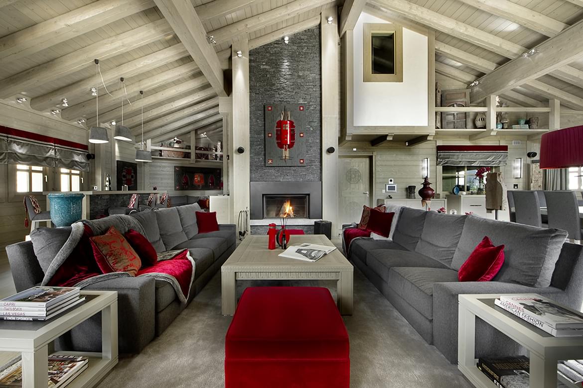 Suite-Chalet Karakoram equipped with modern technology has 4 different levels. The chalet can welcome 10 people in 5 bedrooms, each with en-suite bathroom. Private indoor pool and private ski room. With the same contemporary elegance, furniture covered with grey and red toned fabrics.