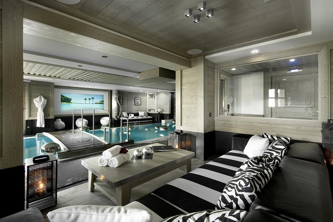 Suite Chalet Panmah has 4 different levels. The chalet can welcome 10 people in 5 bedrooms, each with en-suite bathroom. Private indoor pool with jet-stream and waterfalls. Private ski room. A butler, housekeepers and a chef are at the exclusive disposal of chalet occupants throughout their stay.