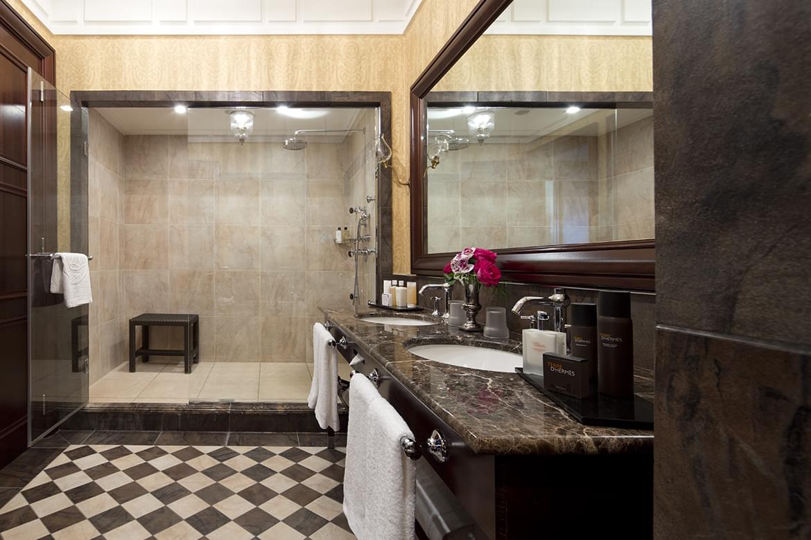 Just as ravishing, the haute-couture chic of the suite with its honey-coloured parquet floors, Louis XVI furniture, bookcase with an enticing collection of original works. A prominent master bedroom opens out to a dressing-room with a vanity cupboard and bathroom, featuring a tub, massage jet shower and Terre d’Hermès products. For even more privacy, you can book the entire 7th floor.