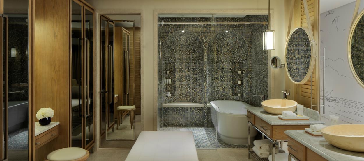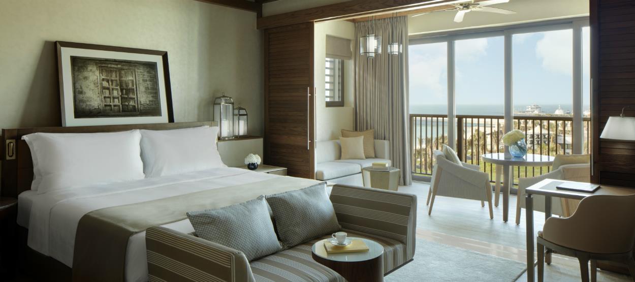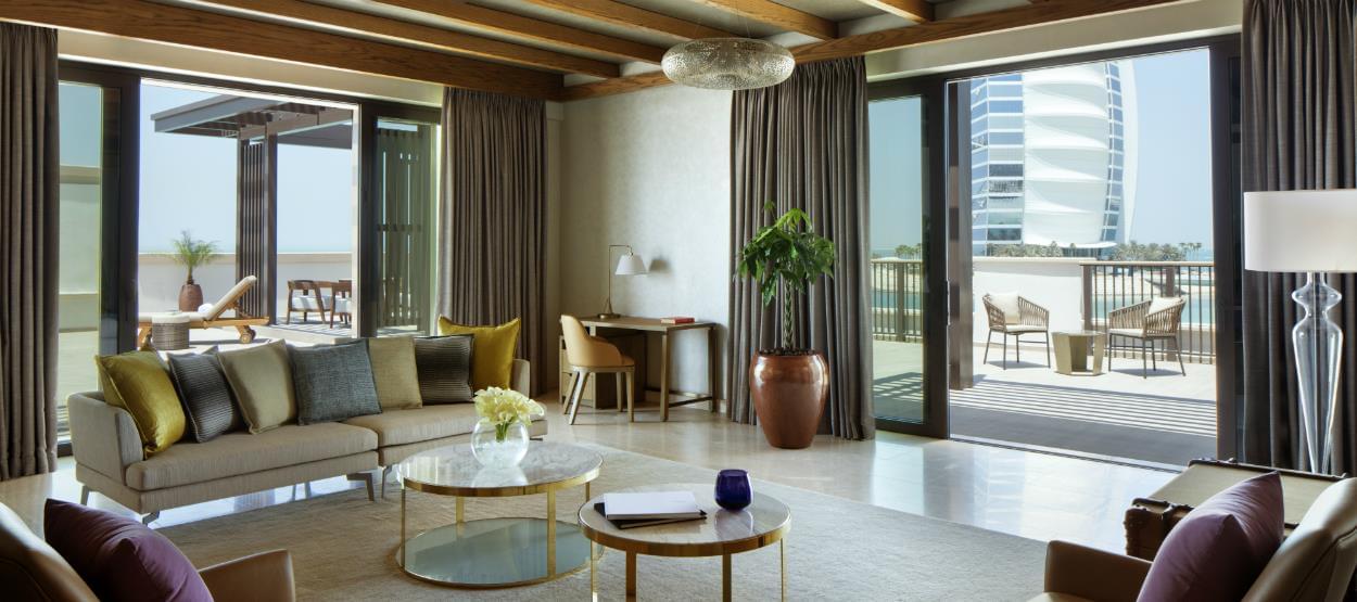 The spectacular Royal Suite located in the center of the Resort with unmatched panoramic views across to Burj Al Arab Jumeirah, the open sea and the skyline of Palm Jumeirah. This suite comprises two large guest bedrooms, extensive living room, cinema room, living outdoors space with landscape garden and its own fitness room. Generous Club benefits and access to Beach Club are included for Royal Suite guests.