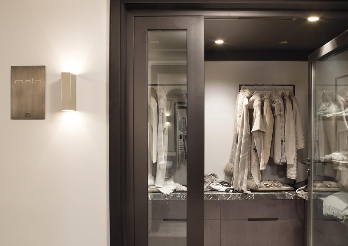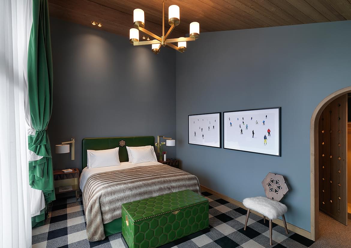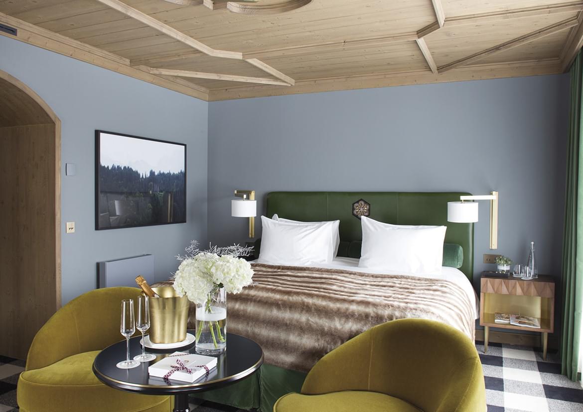 The rooms and suites welcome guests from the pristine slopes into a cocoon of restrained luxury. French interior designer India Madhavi subtly reflects rustic charm in the smooth contemporary style, with furs, soft wool plaid and fine leather caressing the senses.