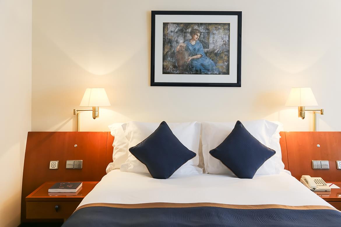 Traditional contemporary room, queen or twin bedded, comprises a large work space and is equipped with either walk-in showers or bathtubs. It is designed with fine detail and features natural and quality materials as marble, wood and glass.