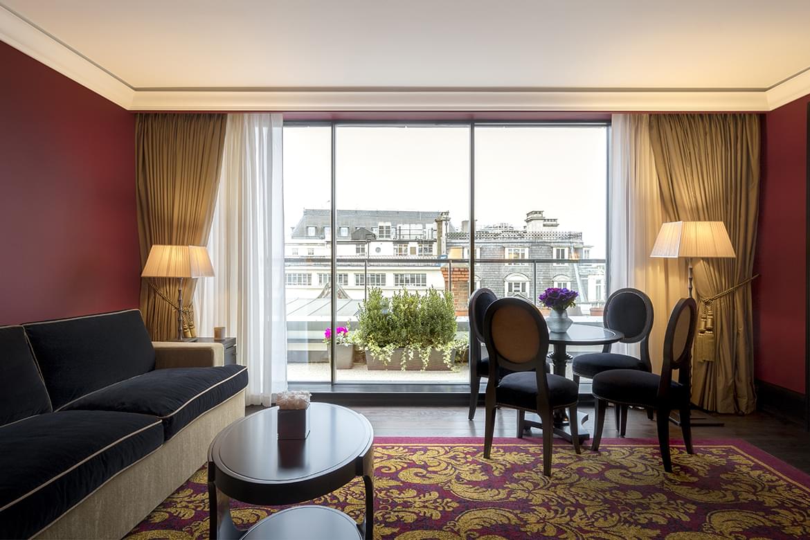 All suites are unique with period features. 35-38 sq.m, super king size bed, spacious marble & onyx bathroom with walk-in shower, bathtub, under floor heating and mist free heated mirror, lounge area with sofa and chairs, large desk, connecting rooms available.