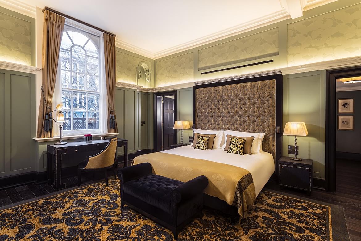Generously proportioned and unique due to historic original accents and period features. 38-45 sq.m, super king or twin bed, marble & onyx bathroom with underfloor heating and mist free heated mirror, lounge area with sofa and chairs, large desk.