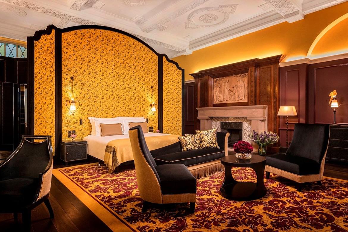 Unique signature suite with a spectacular restored high ceiling, an original Grade II listed fireplace with a Dalton artefact above it. The bed board’s grand feature was designed by Jacques Garcia. 65 sq.m, super king or twin bed, marble and mirrored bathroom with walk-in shower, free standing bathtub, double vanity and under floor heating, luxurious lounge area with large coffee table and sofa, large desk.