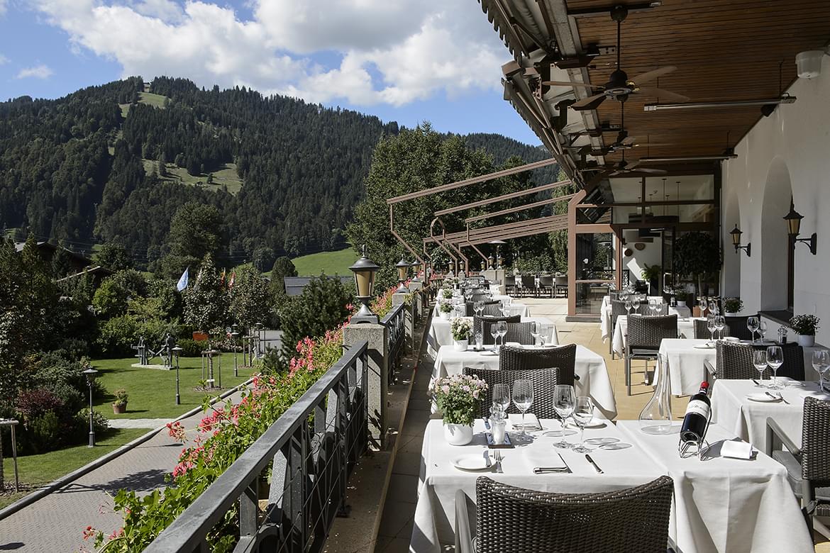 A small, traditional Swiss chalet evoking the natural mountain surroundings, the Waldhuus is nestled away in the gorgeous hotel gardens. Surrounded by cowbells adorning the walls, enjoy regional specialties like Swiss fondue or raclette while seated at hand-carved wooden tables topped with checkered tablecloths and napkins.