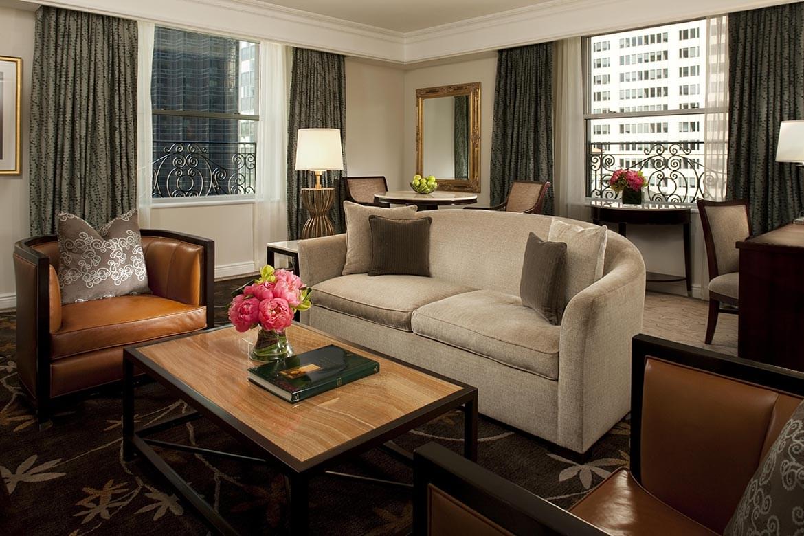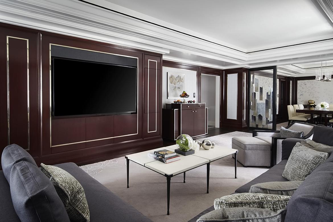 The stately Grand Suite occupies a 20th floor corner location of the hotel overlooking Fifth Avenue with views of Central Park. This magnificent suite includes an elegantly appointed living room with a decorative fireplace and 55-inch LED television and a separate dining room that seats eight people with a butler’s pantry.