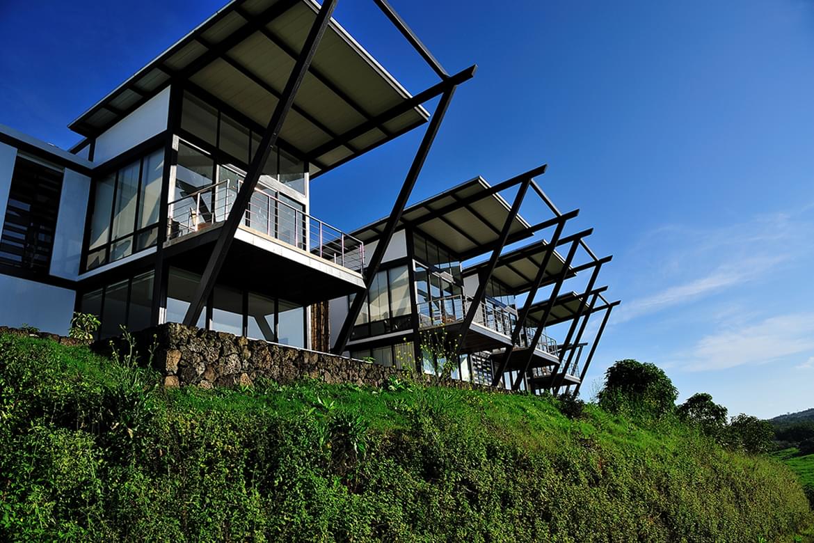 The suite has panoramic floor to ceiling windows with access to a private plunge pool and a shaded terrace with breath-taking unobstructed views. The suite was designed for having optimal natural cross ventilation with thermal insulation for natural cooling. It has remote controlled split air conditioners and ventilators for maximum guest comfort. Floors are made of Bamboo wood and are partially carpeted for bare foot comfort.