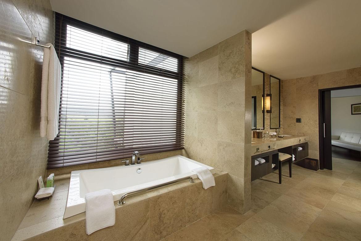 The suite has panoramic floor to ceiling windows with access to a private shaded terrace with breath-taking unobstructed views. Including spacious ground floor terrace with a private garden, with a modern and cosy contemporary style decor. It is furnished with a king size bed and a sofa-bed.