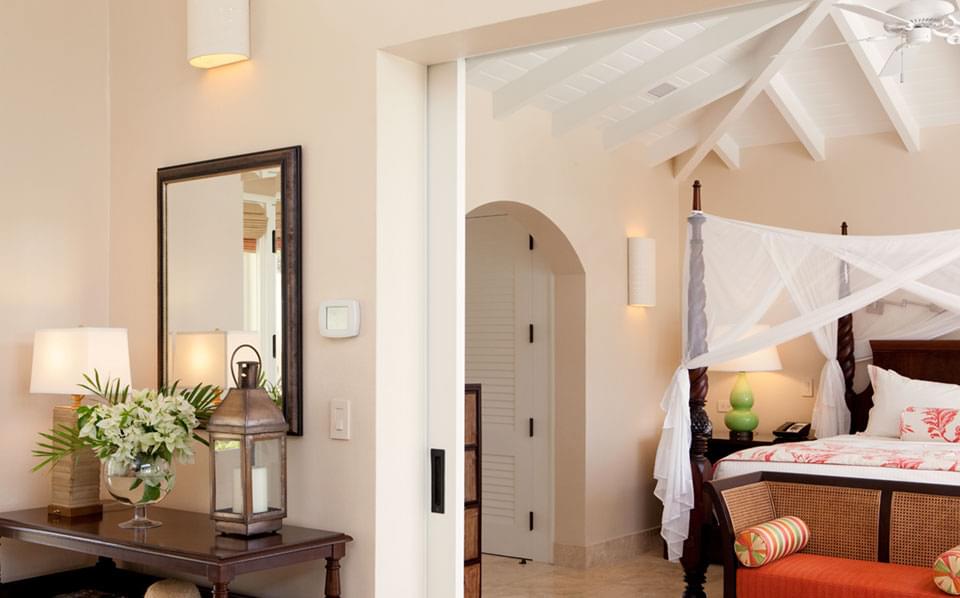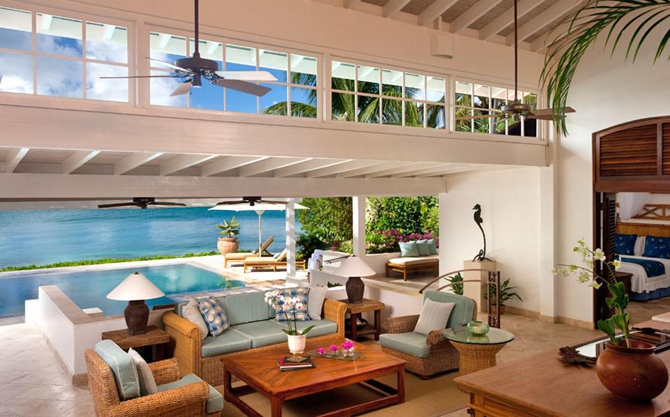 Located in Jumby Bay’s traditional Rondavel cottages, these elegant suites combine luxury with tropical elegance. They feature a separate bedroom, living room, bathroom with a large walk-in shower and a private outdoor garden with a rain shower. A wraparound terrace provides breath-taking views of the sea and a hammock for ultimate relaxation.