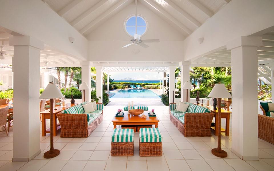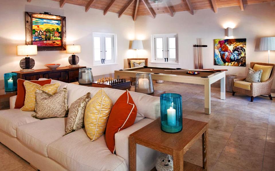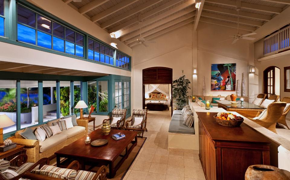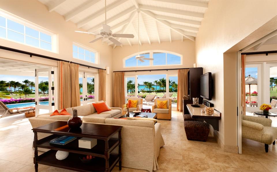 Dramatic views of the Caribbean Sea greet guests each morning at this comfortable four-bedroom retreat. Sea Breeze is elegantly designed and outfitted, spanning 4,681 square feet of indoor-outdoor living space. The villa’s interior colour palette of oatmeal and snow-white is off-set with accents of Caribbean blue which, in turn, complement the home’s British Colonial furnishings. The open, split-level floor plan includes a well-equipped kitchen, living room with vaulted ceilings and ample seating, and formal dining area with seating for eight guests.