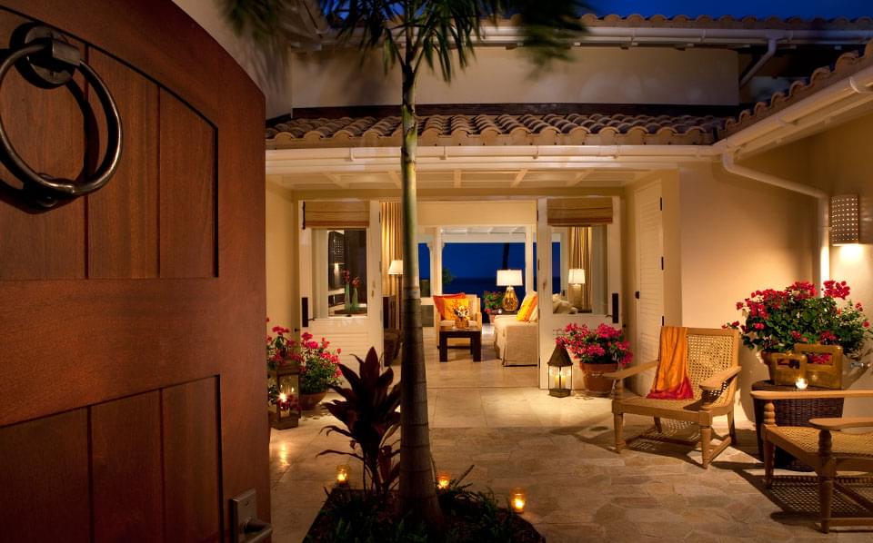 An antique privacy gate and entry courtyard welcome guests to this elegant one-bedroom suite. Beautifully appointed with 1,346 sq. ft. of living space, the suite features a grand room with a vaulted ceiling, living area, separate master bedroom with a spacious bathroom and a private outdoor garden with rain shower and tub. Overlooking the sea with an expansive terrace and a private pool, this is the ultimate retreat for relaxation.