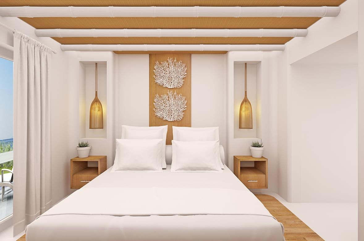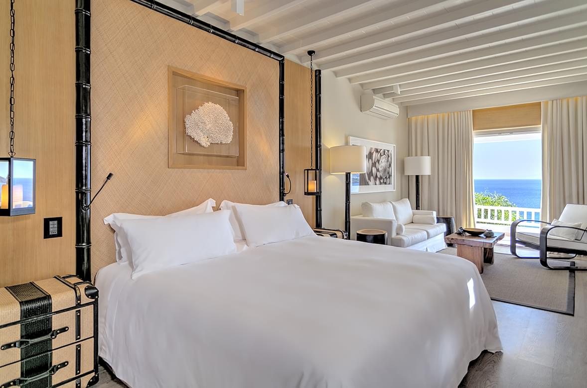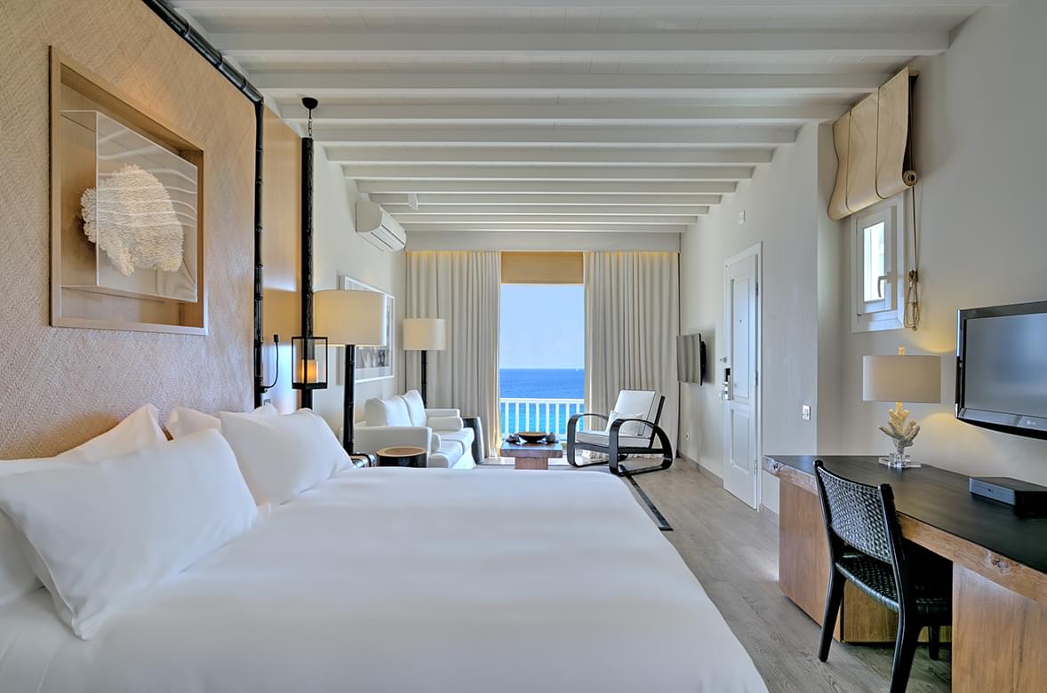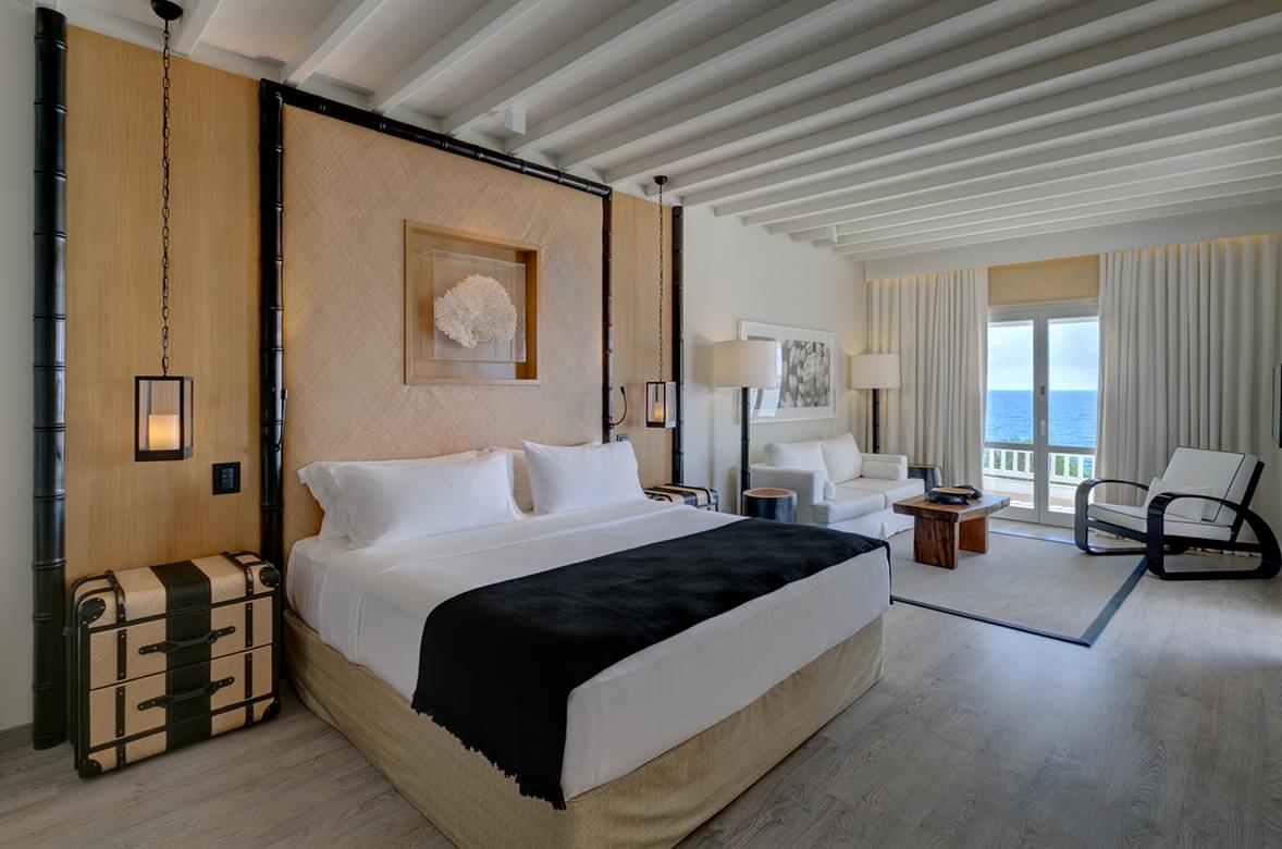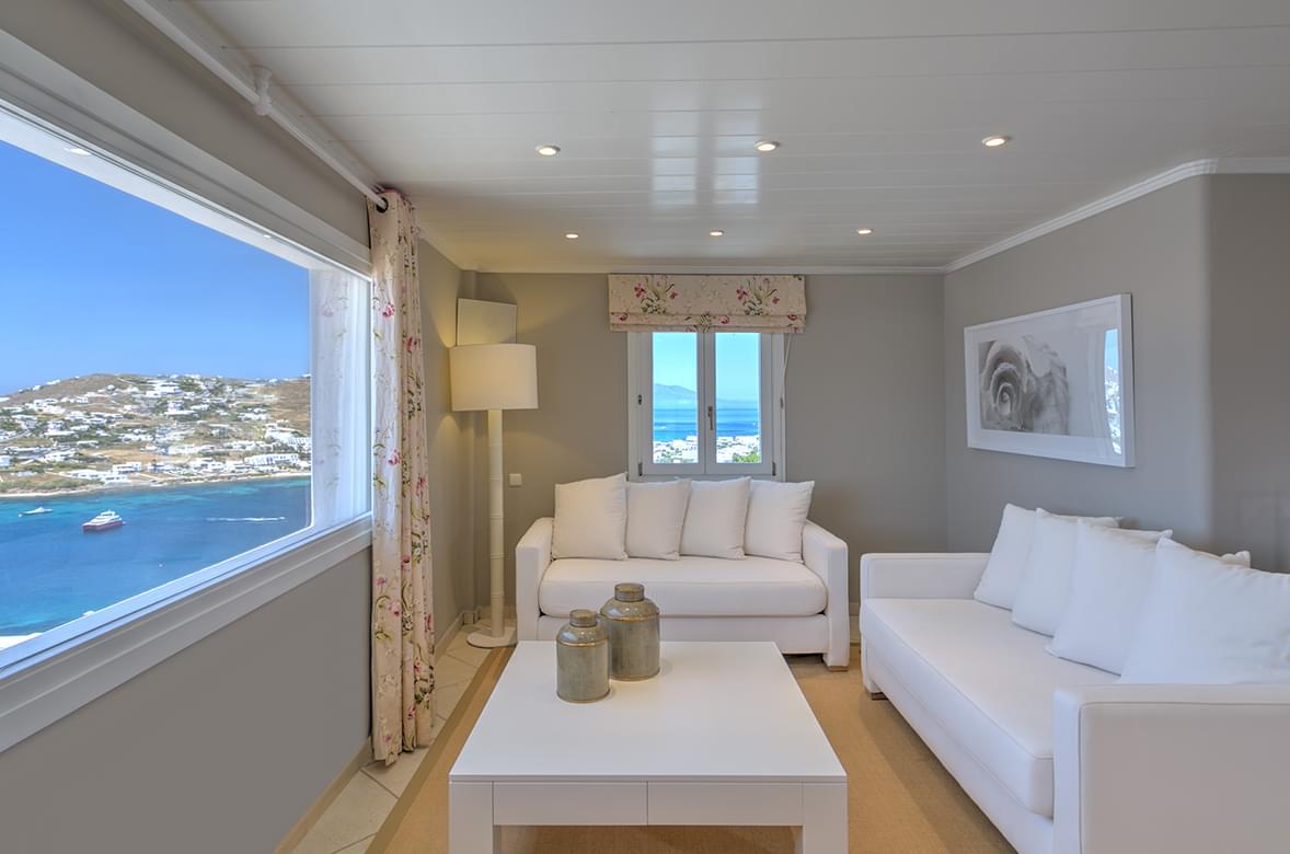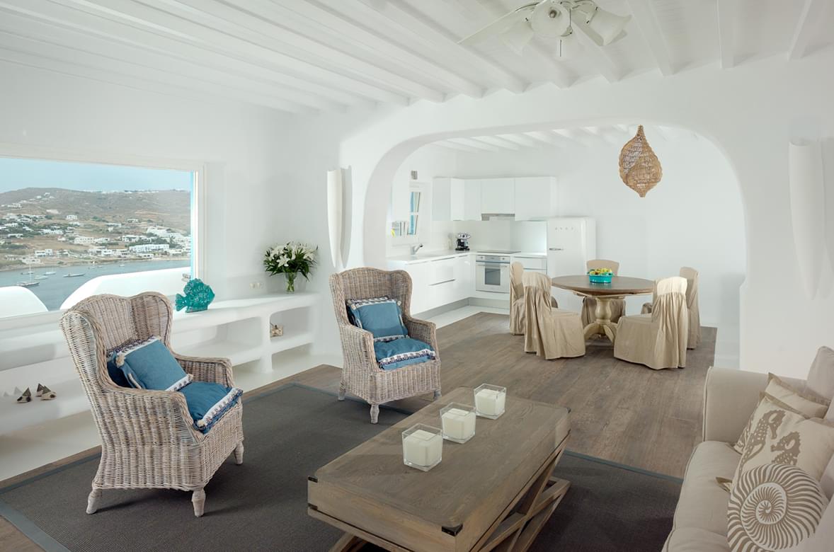 From a private terrace of a Deluxe Seaview Pool Suite, guests can enjoy from a captivating Ornos Bay panorama to a tranquil private pool, which in some suites is surrounded by a lush garden. If you’re looking for a family holiday, the living room’s sofa, chairs, and coffee table encourage communal experiences accompanied by drinks from the mini-bar.