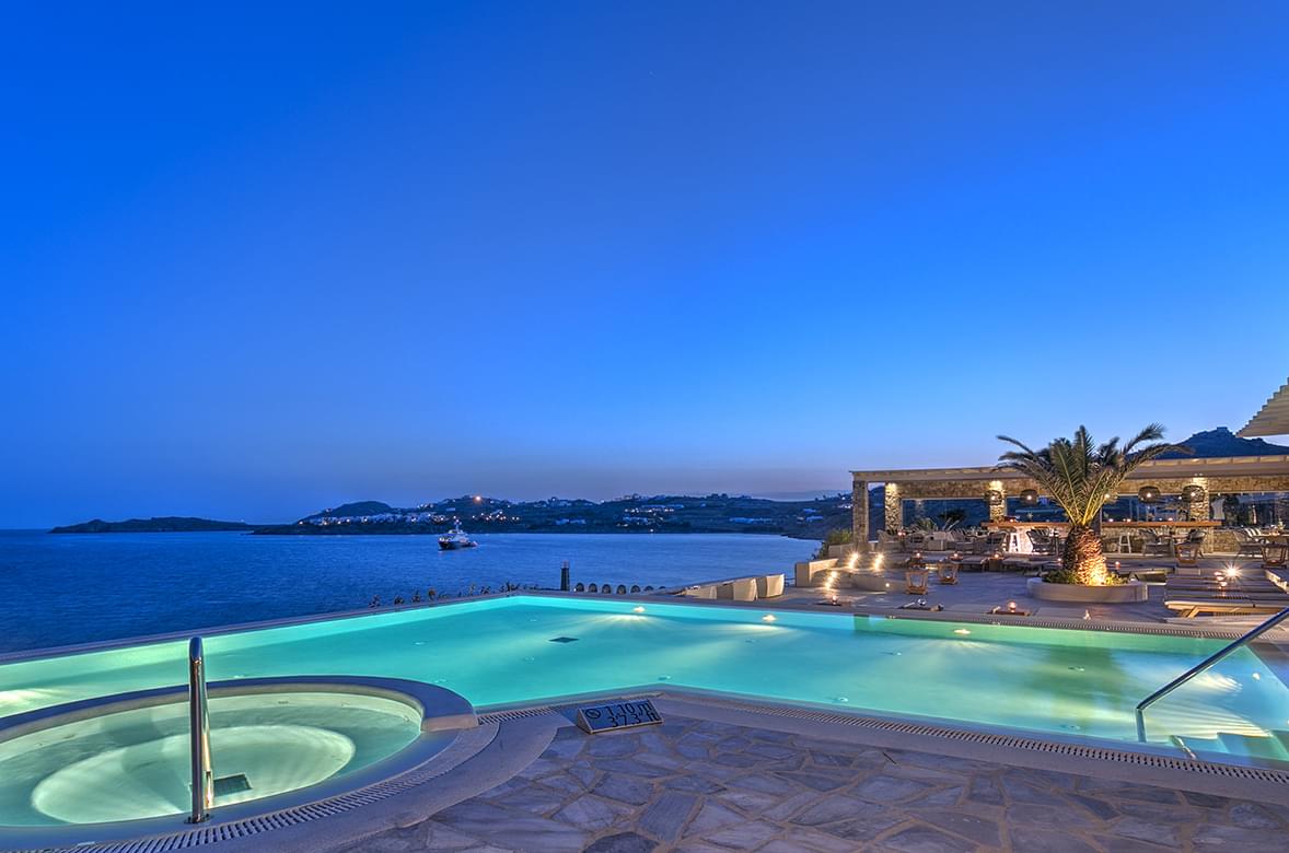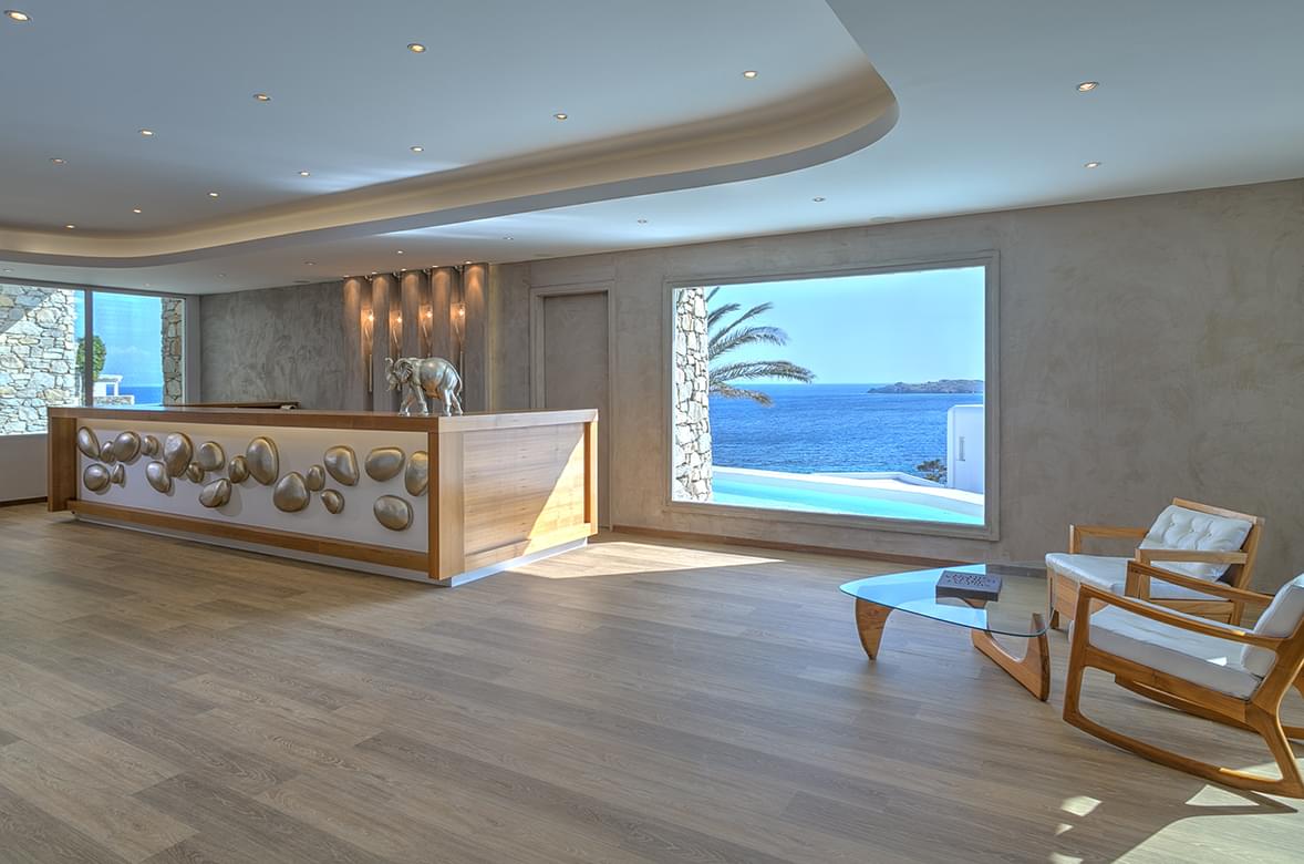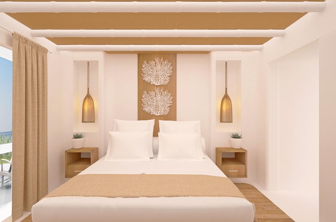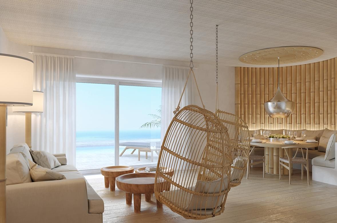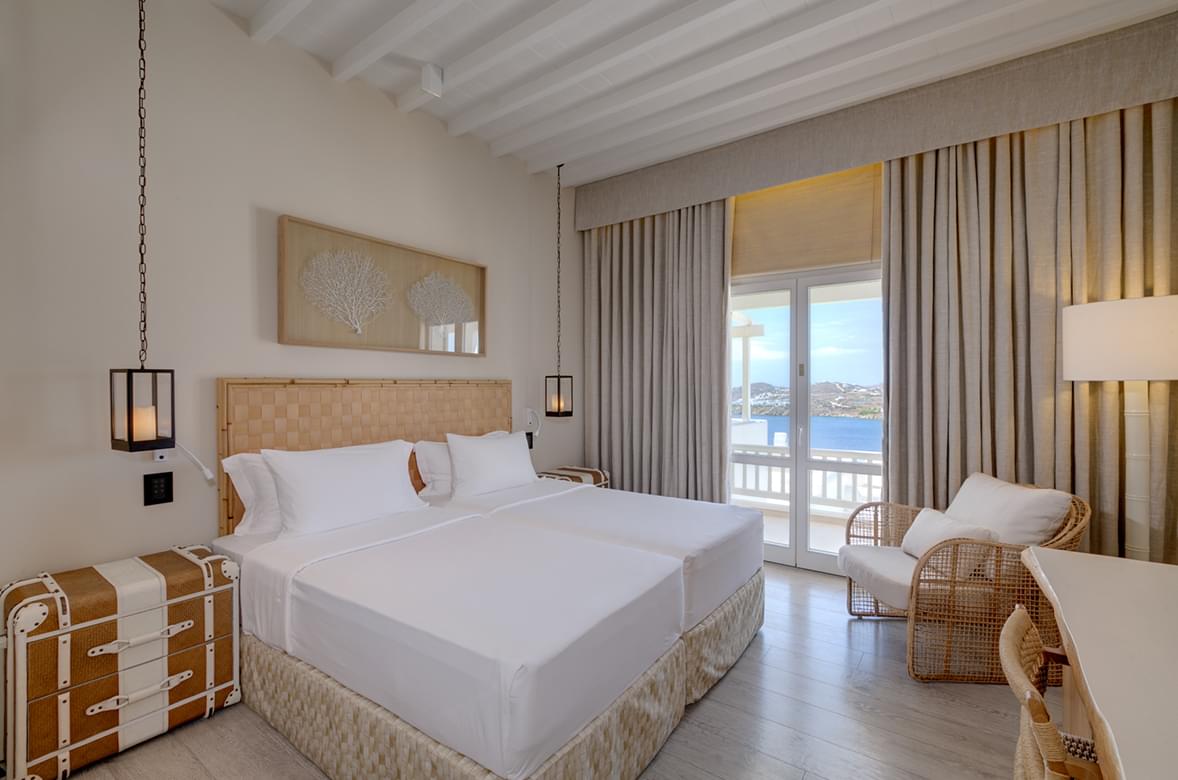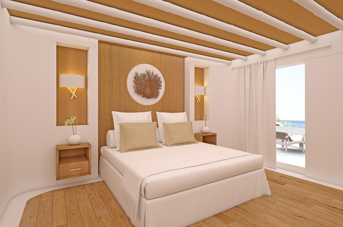From a private terrace of a Deluxe Seaview Pool Suite, guests can enjoy from a captivating Ornos Bay panorama to a tranquil private pool, which in some suites is surrounded by a lush garden. If you’re looking for a family holiday, the living room’s sofa, chairs, and coffee table encourage communal experiences accompanied by drinks from the mini-bar.