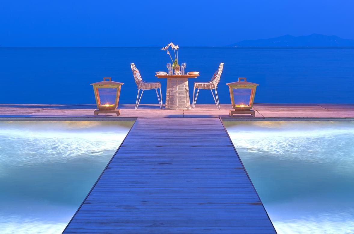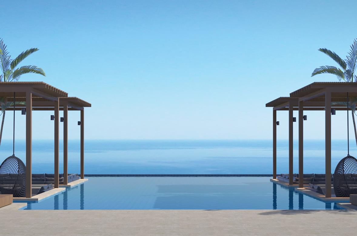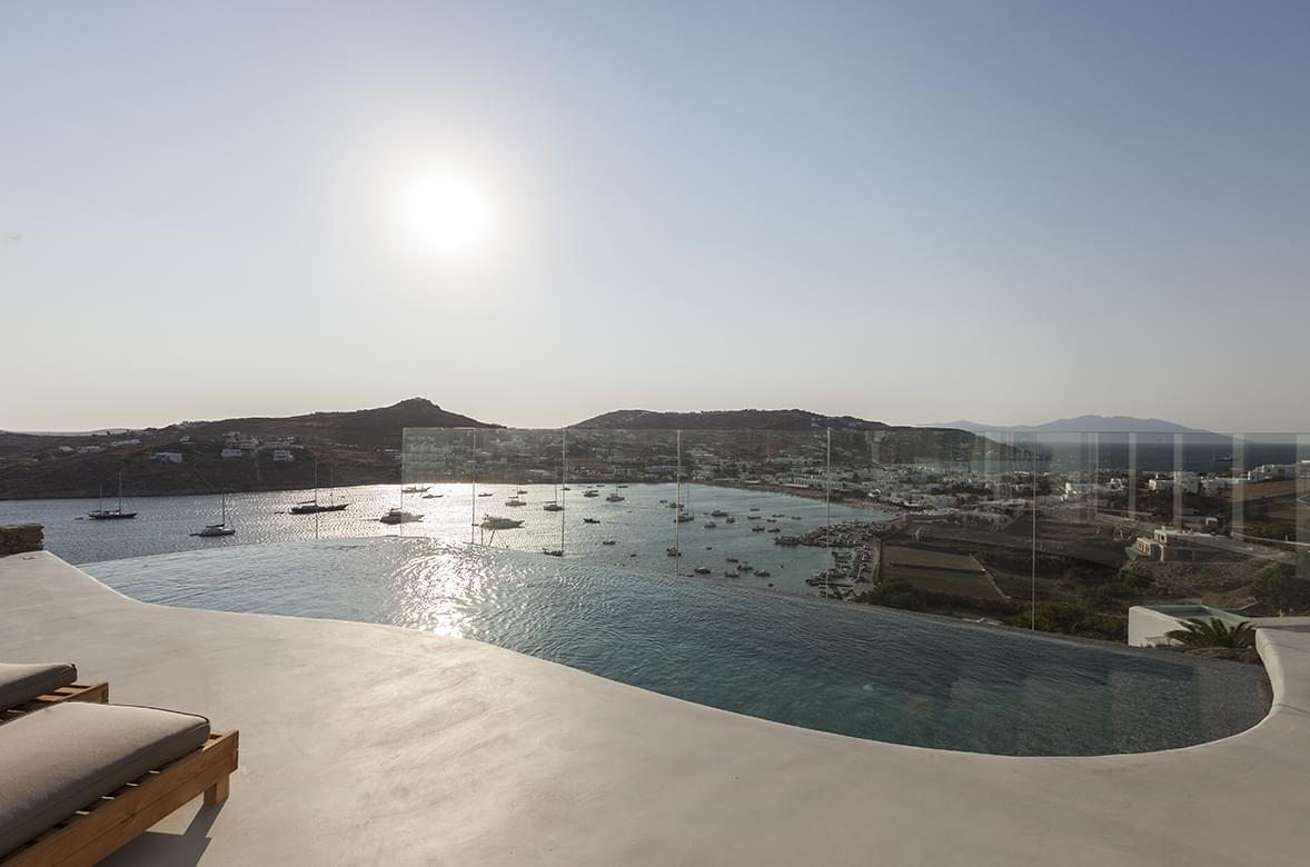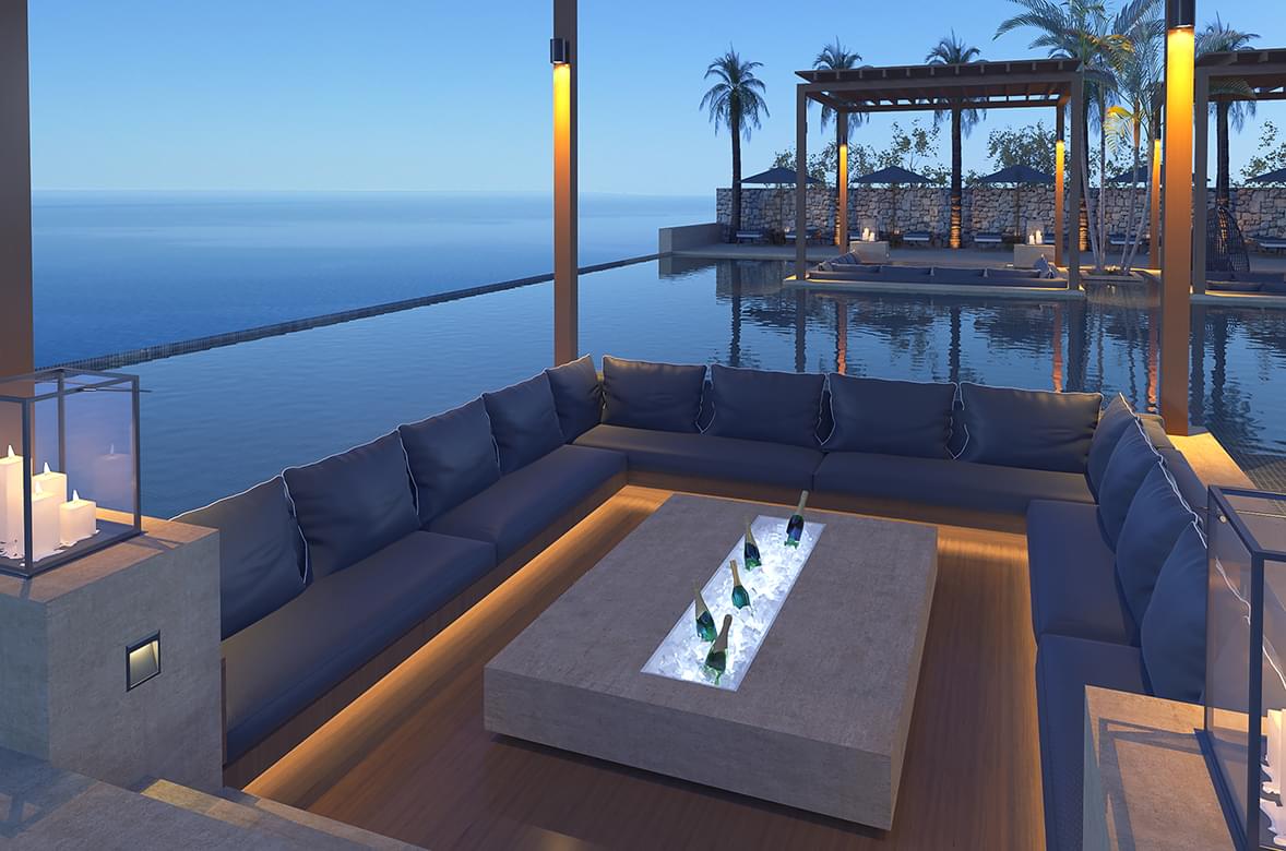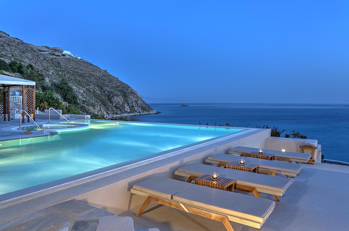 Santa MARINA overlooks the new and inviting infinity-edged pool, where expansive sunken lounge areas offer opportunities for relaxation and socialising. Furnished with comfortable sun loungers, hanging egg chairs and canopied sofas, the area provides an enriching space from which to luxuriate against the backdrop of the Aegean Sea.
