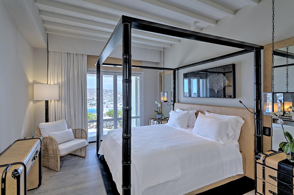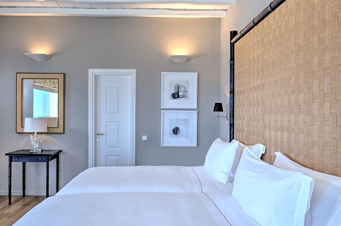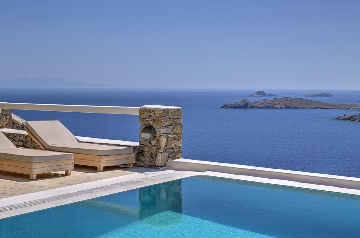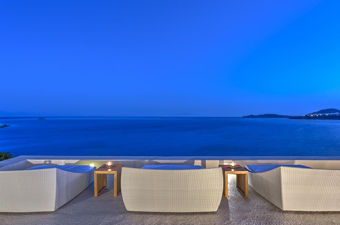 Situated on top of the 20-acre property, Presidential Villa with its own terraces provide sweeping views of nearby Delos, Paros, and Naxos islands as well as Mykonos town. Generous terraces with teak furniture open onto the private infinity pool that merges seamlessly with the sea, supplementing the striking sea views. All bedrooms have mosaic and marble bathrooms—the two master bathrooms are equipped with Jacuzzi tubs.