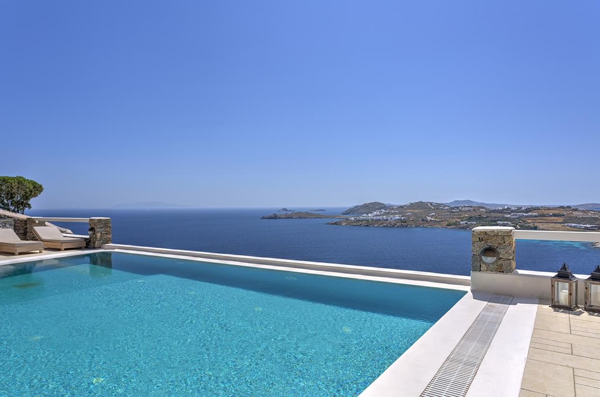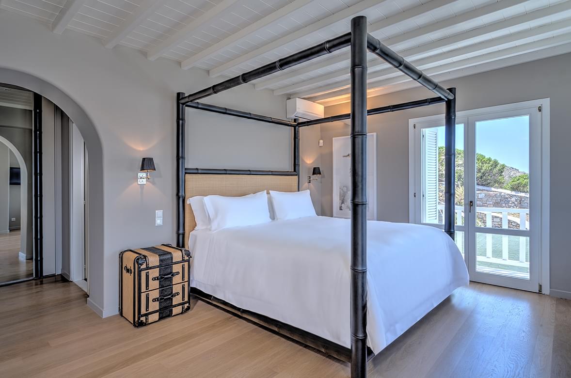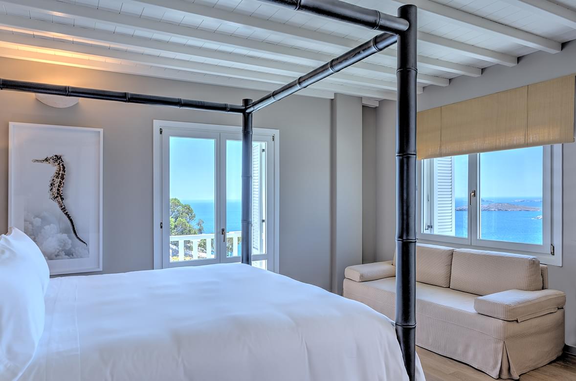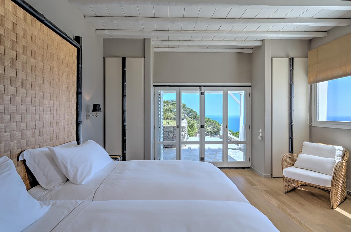 Situated on top of the 20-acre property, Presidential Villa with its own terraces provide sweeping views of nearby Delos, Paros, and Naxos islands as well as Mykonos town. Generous terraces with teak furniture open onto the private infinity pool that merges seamlessly with the sea, supplementing the striking sea views. All bedrooms have mosaic and marble bathrooms—the two master bathrooms are equipped with Jacuzzi tubs.