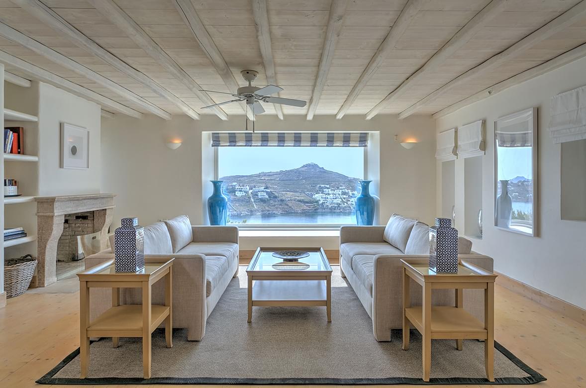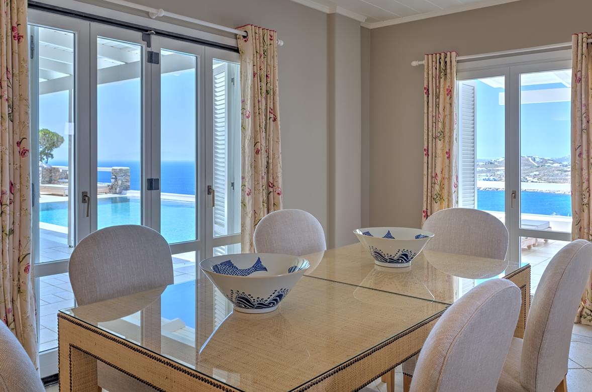 Another family favourite, the three-bedroom Villa Lapis Lazuli, Villa Sapphire, and Villa Emerald offer complete autonomy. Each villa is decorated in characteristic island style, as peach-hued walls meet whitewashed ceilings and traditional wooden furniture. Outside, spacious balconies with magnificent views are furnished with chaise lounges and house private infinity pools that seem to flow seamlessly to the Aegean Sea.