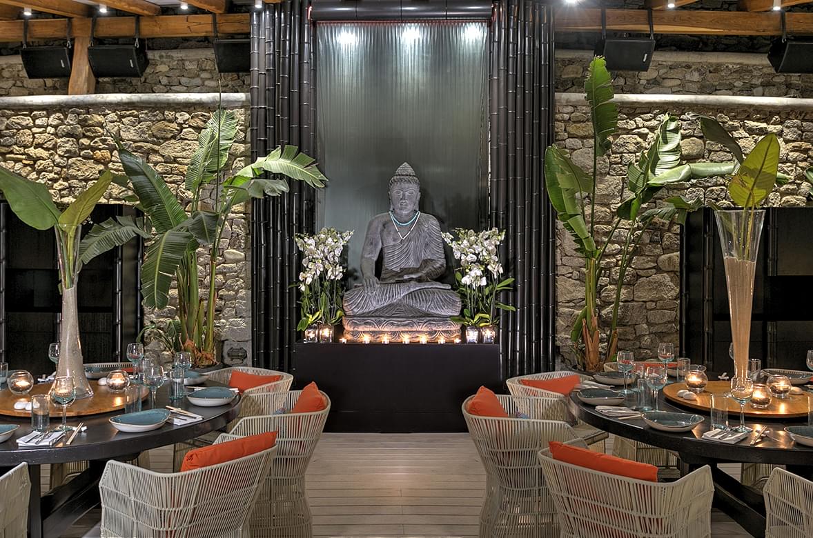 Undoubtedly one of Mykonos’ hotspots, Buddha Bar Beach invites guests to a distinctive experience that combines the renowned restaurant’s signature atmosphere with unparalleled views of the Aegean Sea.