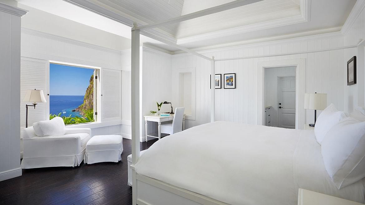 With 1,455 square feet of space, this single story accommodation features a master bedroom with a king-sized bed and a second bedroom with two queen-sized beds, and can sleep four adults or two adults and two children. Guests will enjoy a view of the Pitons and the white sands of Sugar Beach across the property’s infinity pool.