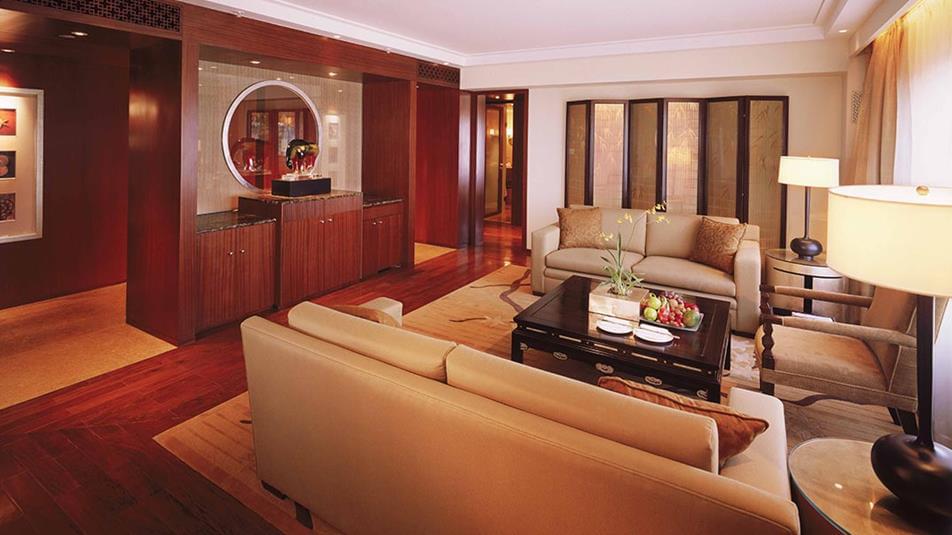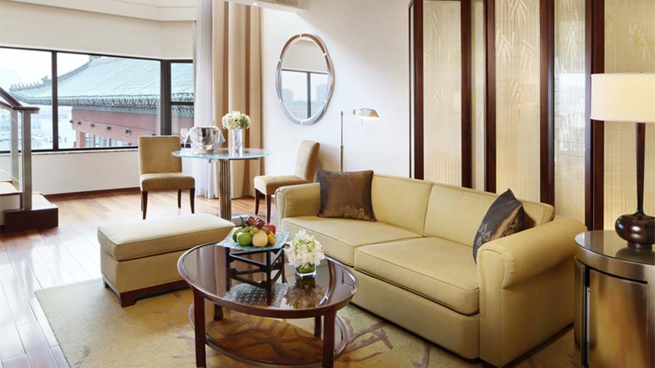 Duplex Suites occupy the top floors of the hotel, and are fabulously appointed as penthouse city centre apartments with Chinese elements providing a light and airy contemporary ambience. Set over two floors, these suites have neutral tones accented with gold and mustards, and light hardwood floors with area rugs with contemporary Chinese motifs. Spectacular views of the city are a feast for the eyes through the double-height, floor-to-ceiling windows. Guests can fully relax in the homely residential feel of these duplex suites, where the tastefully appointed living room on the first level with its own powder room for added convenience is separated from the elegant and contemporary bedroom with an en-suite marble bathroom on the upper level accessed by an internal staircase.