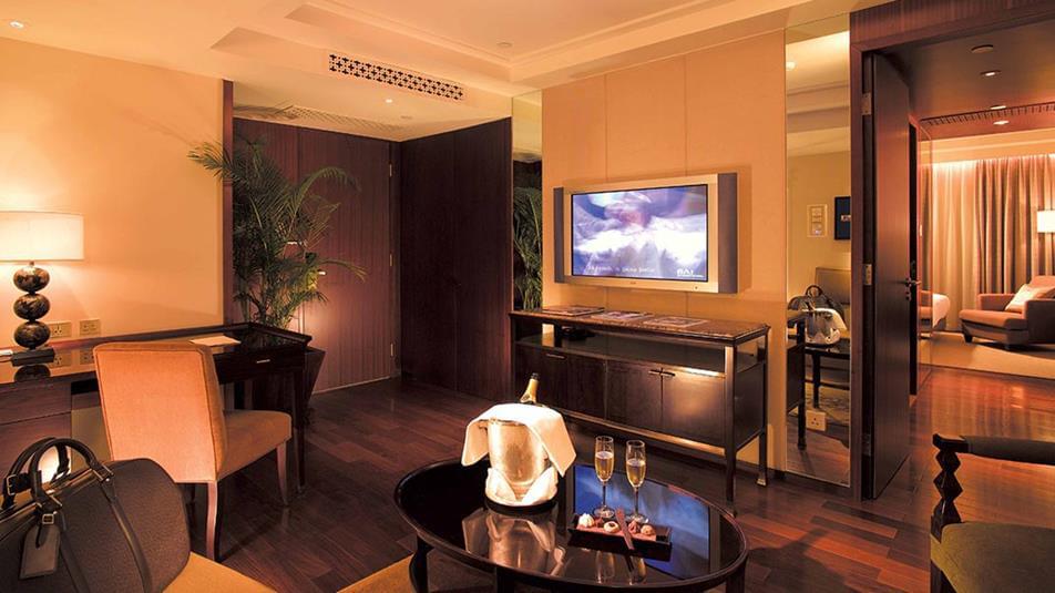 Deluxe Suites provide an enchanting and unforgettable experience. The elegantly appointed living room boasts separate dining and desk areas luxuriously decorated with deep woods and gold tones. This opulent suite has a bedroom and a dedicated seating area fully equipped with customised touch room controls and MP3/4 connectivity, allowing guests to play their own music and videos through the hotel system on 42-inch plasma flat-screen televisions with CD/DVD players stocked with a comprehensive movie library. Each suite also features a lavish marble bathroom and a guest powder room.