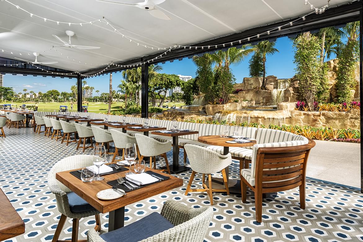 American-inspired kitchen and bar offering contemporary cuisine that attracts those looking for lighter comfort food. Its open kitchen offers authentic creations in a friendly, sophisticated setting. A perfect gathering place for breakfast, lunch, dinner, after work or a spirited night out. Beautifully designed, the casually elegant environment flows onto an outdoor patio overlooking a scenic tropical oasis and the resort’s acclaimed championship golf courses.