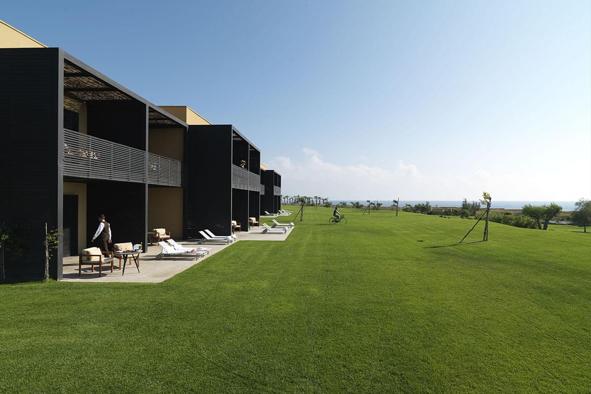 Set across 230 hectares of olive groves and countryside, the rooms are in two distinct types of building, Courtyard and Landscape, which are woven subtly into the landscape and offer a real sense of privacy and space. Natural materials such as stone, sand, wood and cane echo the traditional architecture of Sicily, and rooms make imaginative use of both outdoor and indoor space.