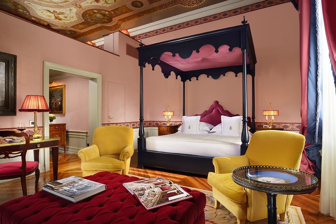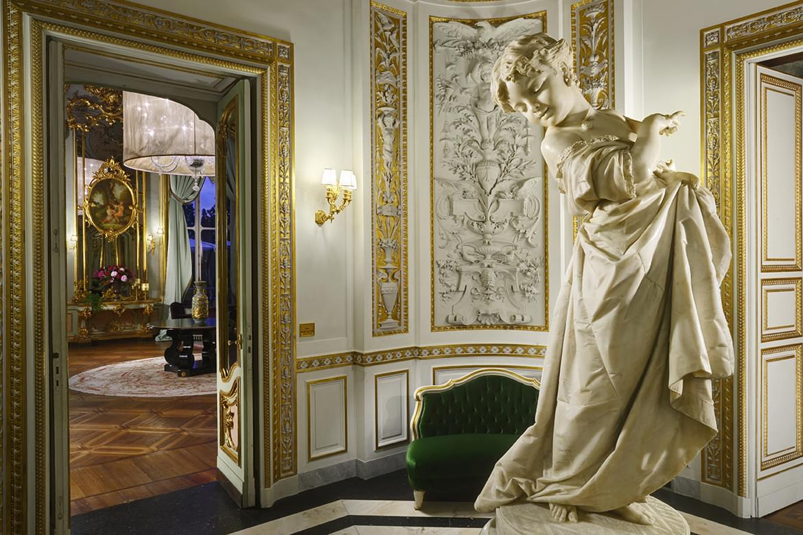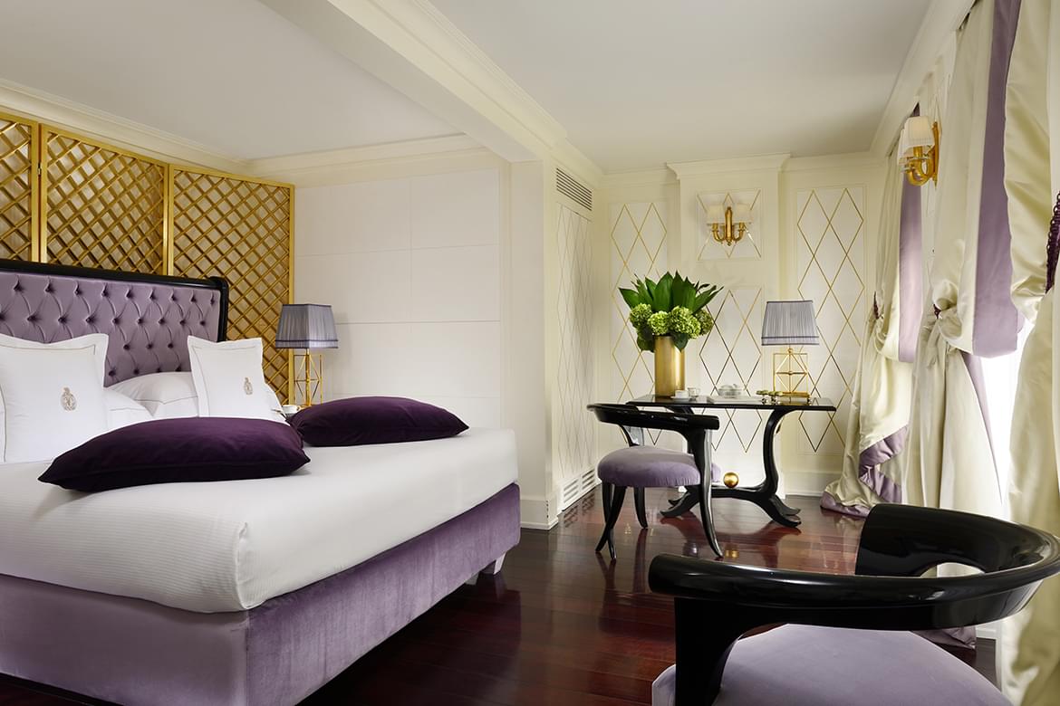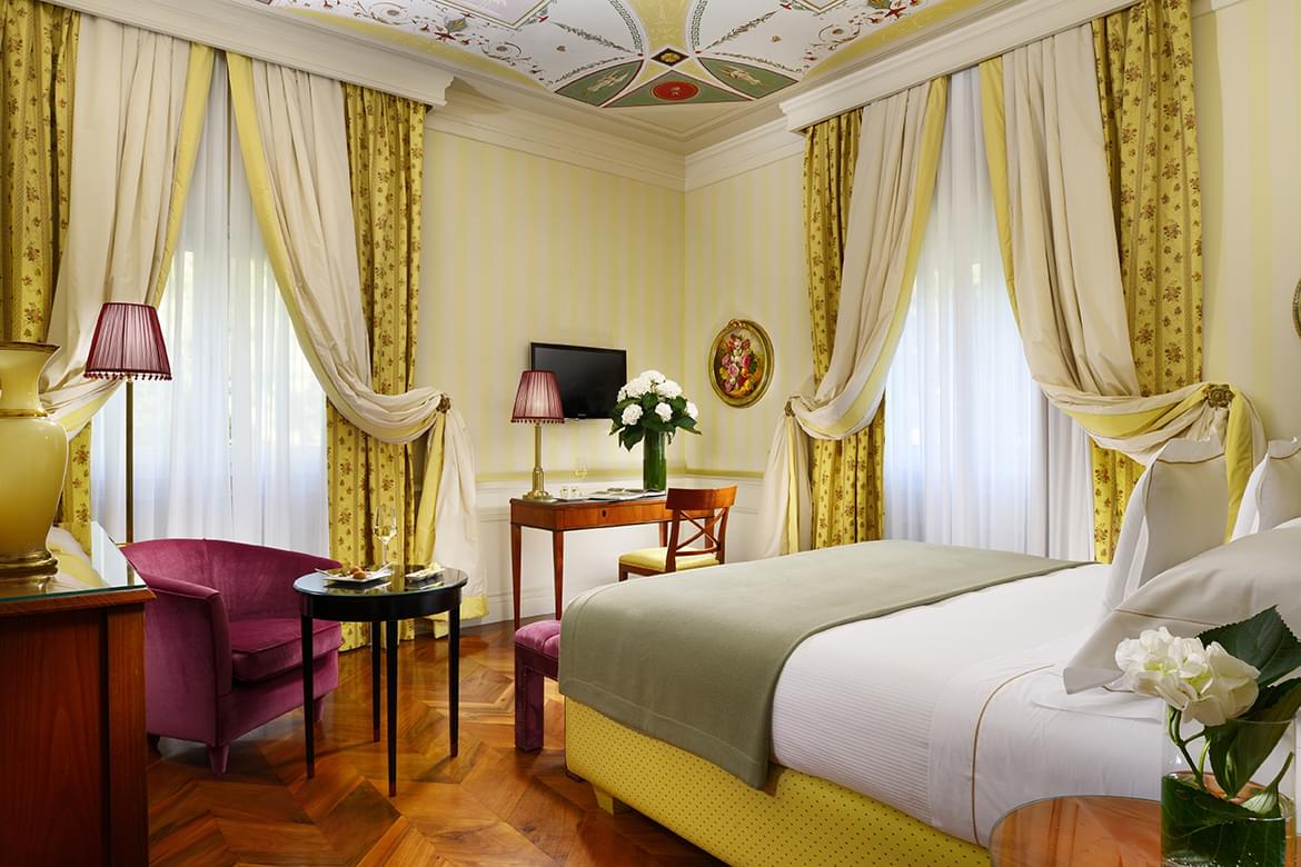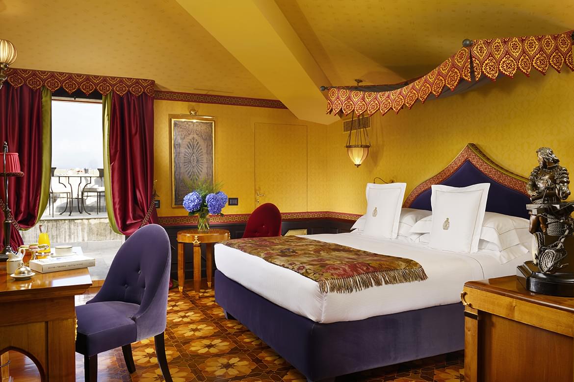 The hotel has 46 rooms and suites, divided into the main villa and in two adjacent buildings, which were restored to the minutest of details with the aim of conserving the original architectural style as much as possible. In the main villa, there are 30 suites and rooms divided into 4 floors, each with its own style. The first, known as the “noble floor” is strongly characterized by its marvellous frescoes; the second dedicated to the ex-empress Eugenia widow of Napoleon III and to the roses that were her favourite flower: the third is the floor dedicated to the Orient, in pure Moorish spirit. Lastly, a pearl, the junior suite 401 inspired by the American fabulous ’50’s.